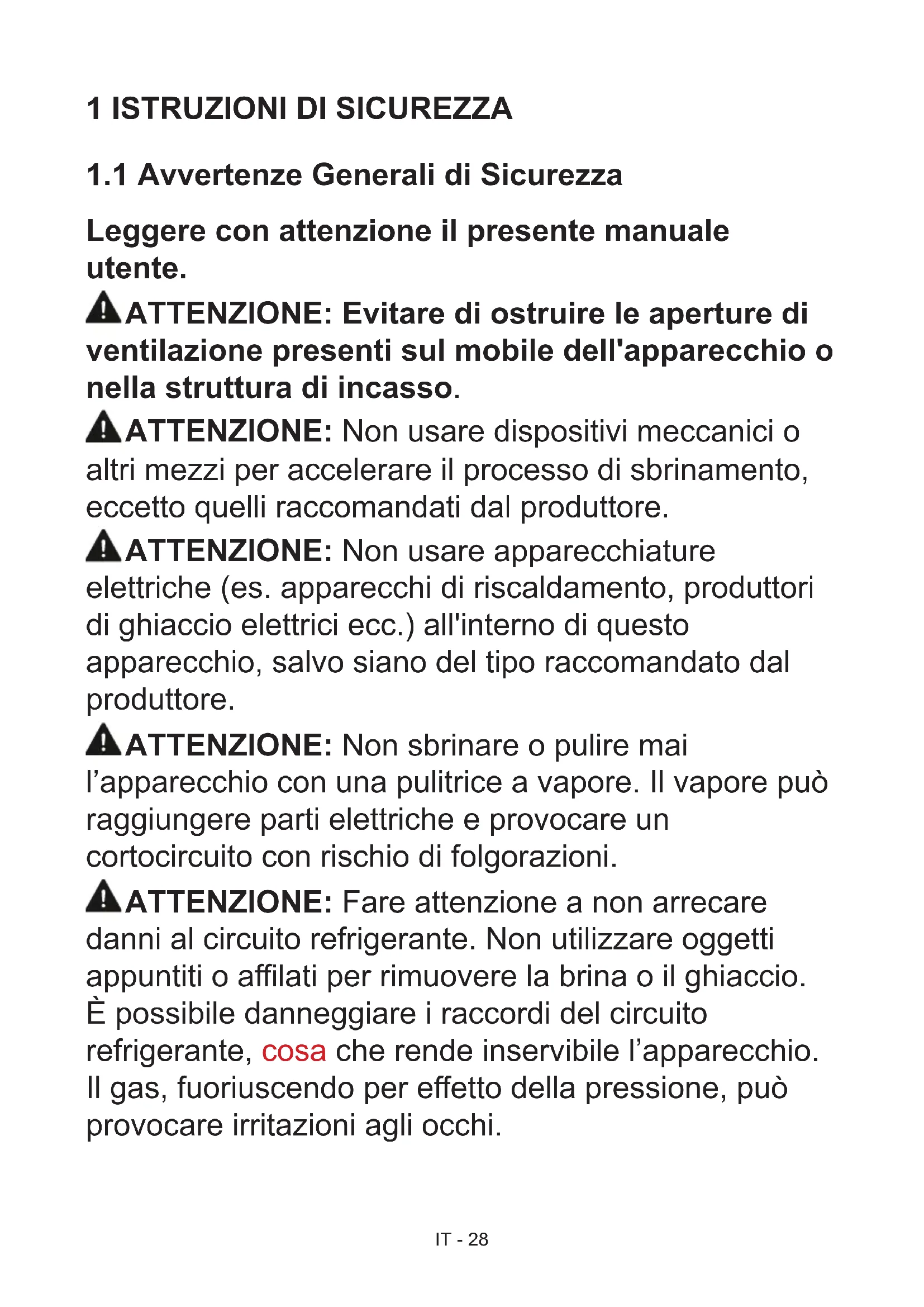 ATTENZIONE: Fare attenzione a non arrecare danni al circuito refrigerante. Non utilizzato oggetti appuntiti o affiliati per rimuovere la brina o il ghiaccio. è possibile danneggiare i raccordi del circuito refrigerante, casa che rende inservibile l'apparecchio. Il gas, fuoriuscendo per effetto della pressione, può provocare irritazioniagli occhi.