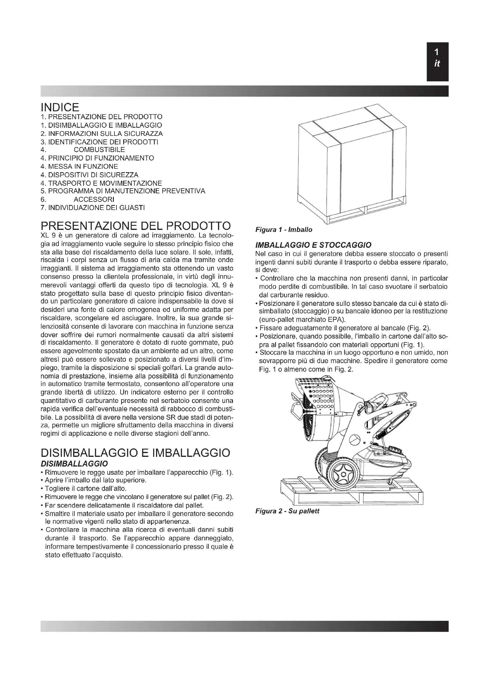 XL 9 è un generatore di calore ad irraggiamento. La tecnolo- gia ad irraggiamento vuole seguire lo stesso principio sico che sta alla base del riscaldamento della luce solare. Il sole, infatti, riscalda i corpi senza un usso di aria calda ma tramite onde irraggianti. Il sistema ad irraggiamento sta ottenendo un vasto consenso presso la clientela professionale, in virtù degli innu- merevoli vantaggi oerti da questo tipo di tecnologia. XL 9 è stato progettato sulla base di questo principio sico diventan- do un particolare generatore di calore indispensabile la dove si desideri una fonte di calore omogenea ed uniforme adatta per riscaldare, scongelare ed asciugare. Inoltre, la sua grande si- lenziosità consente di lavorare con macchina in funzione senza dover sorire dei rumori normalmente causati da altri sistemi di riscaldamento. Il generatore è dotato di ruote gommate, può essere agevolmente spostato da un ambiente ad un altro, come altresì può essere sollevato e posizionato a diversi livelli d’im- piego, tramite la disposizione si speciali golfari. La grande auto- nomia di prestazione, insieme alla possibilità di funzionamento in automatico tramite termostato, consentono all’operatore una grande libertà di utilizzo. Un indicatore esterno per il controllo quantitativo di carburante presente nel serbatoio consente una rapida verica dell’eventuale necessità di rabbocco di combusti- bile. La possibilità di avere nella versione SR due stadi di poten- za, permette un migliore sfruttamento della macchina in diversi regimi di applicazione e nelle diverse stagioni dell’anno.