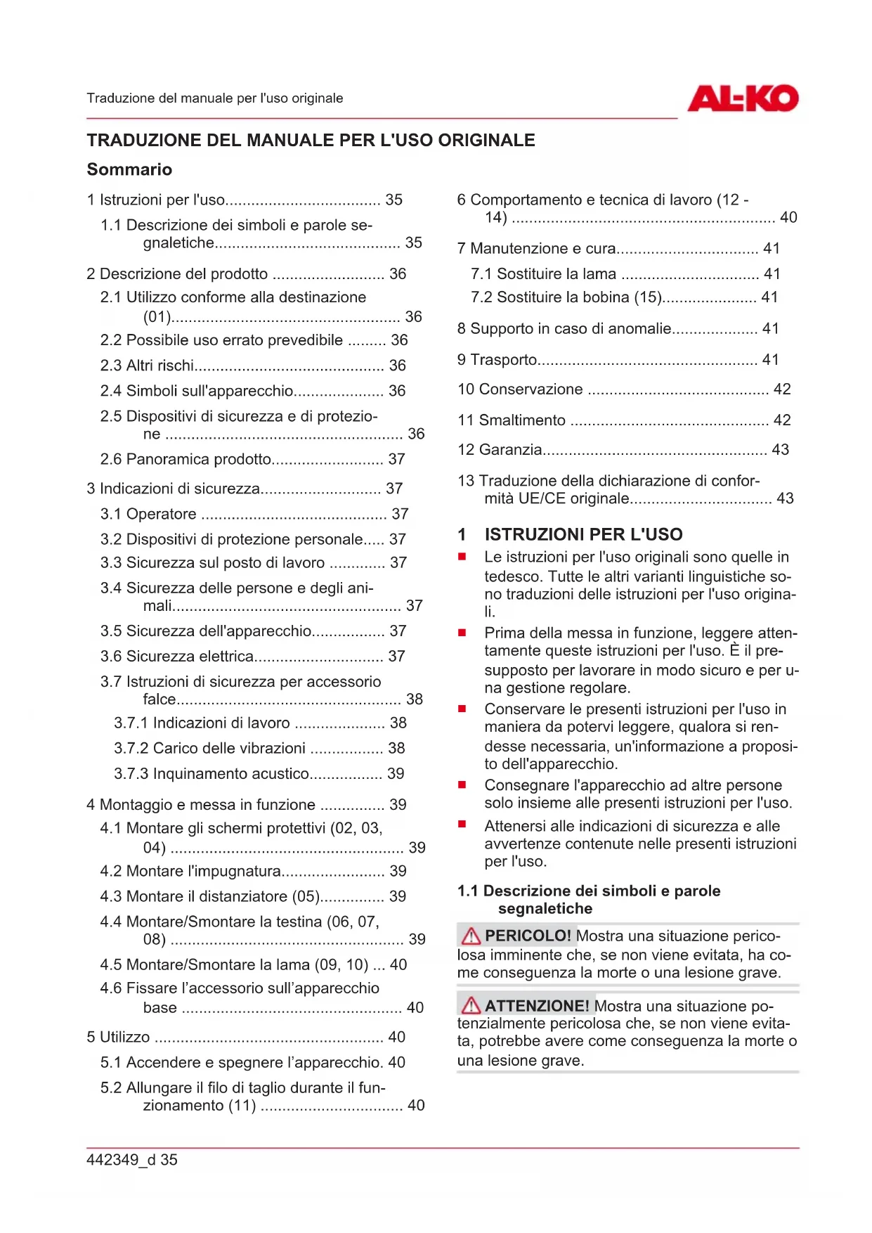 L'accessorio falce deve essere utilizzato solo in combinazione con l'apparecchio base. L’apparec- chio completo può essere eventualmente utilizza- to come trimmer e come un decespugliatore. L’apparecchio dotato di una bobina è destinato e- sclusivamente al taglio di erba soffice e vegeta- zione simile. Con la lama a 3 denti viene utilizza- to per il taglio più piante più robuste, giovane sot- tobosco e cespugli. L’apparecchio deve essere condotto a terra. L'apparecchio di base e gli accessori sono desti- nati esclusivamente per uso privato. Ogni altro u- tilizzo e modifica o installazione verranno consi- derati estranei alla destinazione d'uso e avranno come conseguenza la decadenza della garanzia, oltre alla perdita della conformità (marchio CE) e al rifiuto da parte del costruttore di qualsiasi re- sponsabilità rispetto a danni all'utente o a terzi.
