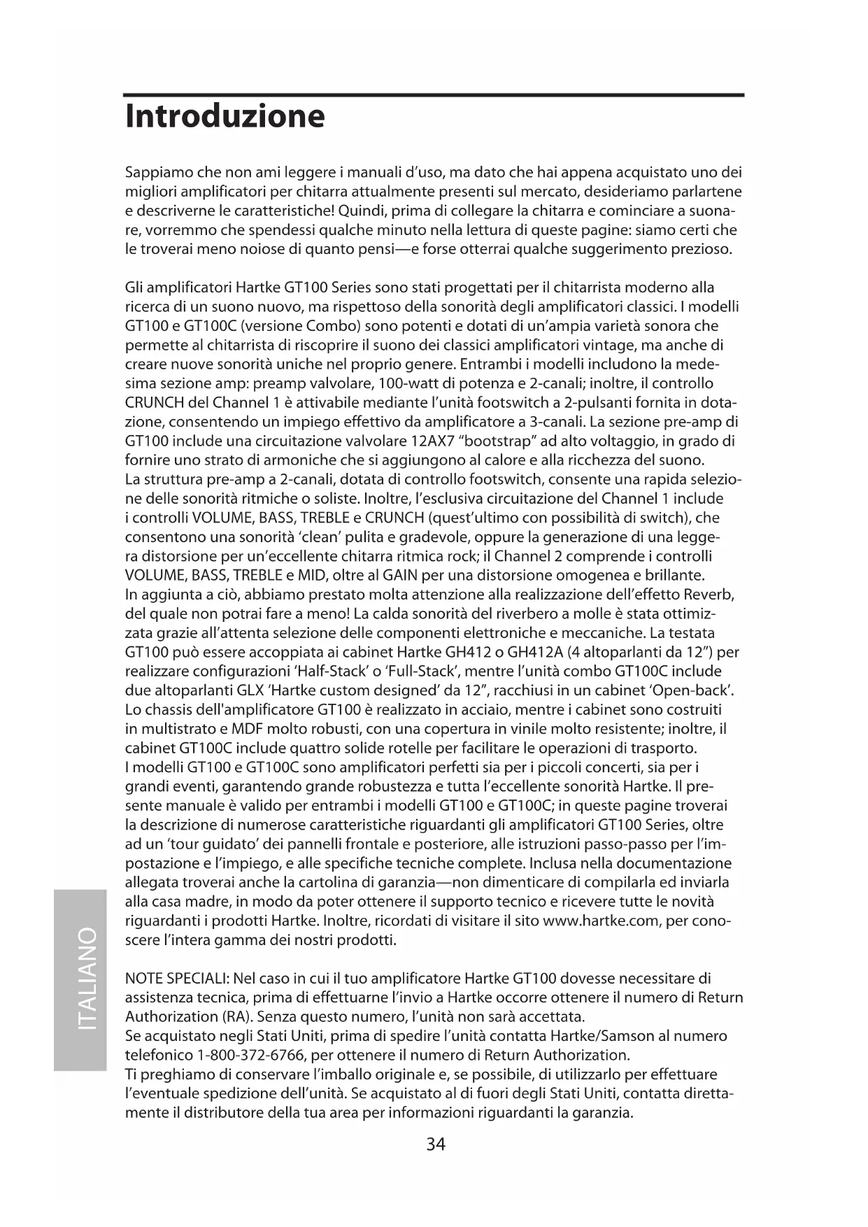 NOTE SPECIALI: Nel caso in cui il tuo amplificatore Hartke GT100 dovesse necessitate di assistenza tecnica, prima di effettuarne l'invio a Hartke occorre ottenere il numero di Return Authorization (RA). Senza quello numero, l'unità non sare accettata.