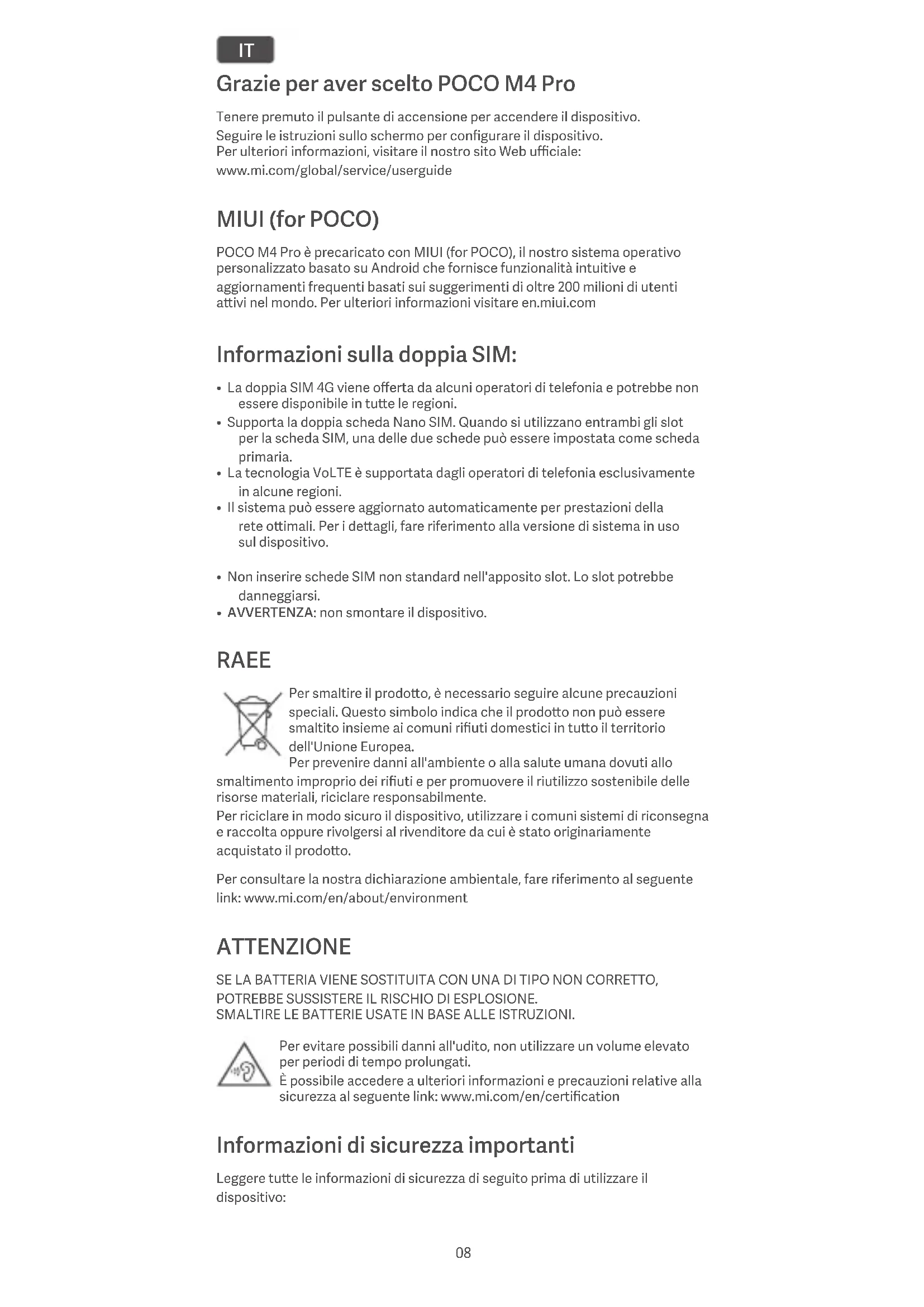 - AVVERTENZA: non smontare il dispositivo. RAEE Per smaltire il prodoo, è necessario seguire alcune precauzioni speciali. Questo simbolo indica che il prodoo non può essere smaltito insieme ai comuni rifiuti domestici in tuo il territorio dell'Unione Europea. Per prevenire danni all'ambiente o alla salute umana dovuti allo smaltimento improprio dei rifiuti e per promuovere il riutilizzo sostenibile delle risorse materiali, riciclare responsabilmente. Per riciclare in modo sicuro il dispositivo, utilizzare i comuni sistemi di riconsegna e raccolta oppure rivolgersi al rivenditore da cui è stato originariamente acquistato il prodoo. Per consultare la nostra dichiarazione ambientale, fare riferimento al seguente link: www.mi.com/en/about/environment ATTENZIONE SE LA BATTERIA VIENE SOSTITUITA CON UNA DI TIPO NON CORRETTO, POTREBBE SUSSISTERE IL RISCHIO DI ESPLOSIONE. SMALTIRE LE BATTERIE USATE IN BASE ALLE ISTRUZIONI. Per evitare possibili danni all'udito, non utilizzare un volume elevato per periodi di tempo prolungati. È possibile accedere a ulteriori informazioni e precauzioni relative alla sicurezza al seguente link: www.mi.com/en/certification Informazioni di sicurezza importanti Leggere tue le informazioni di sicurezza di seguito prima di utilizzare il dispositivo: 08• L'uso di cavi, alimentatori o baerie non autorizzati può provocare incendi, esplosioni o comportare altri rischi.