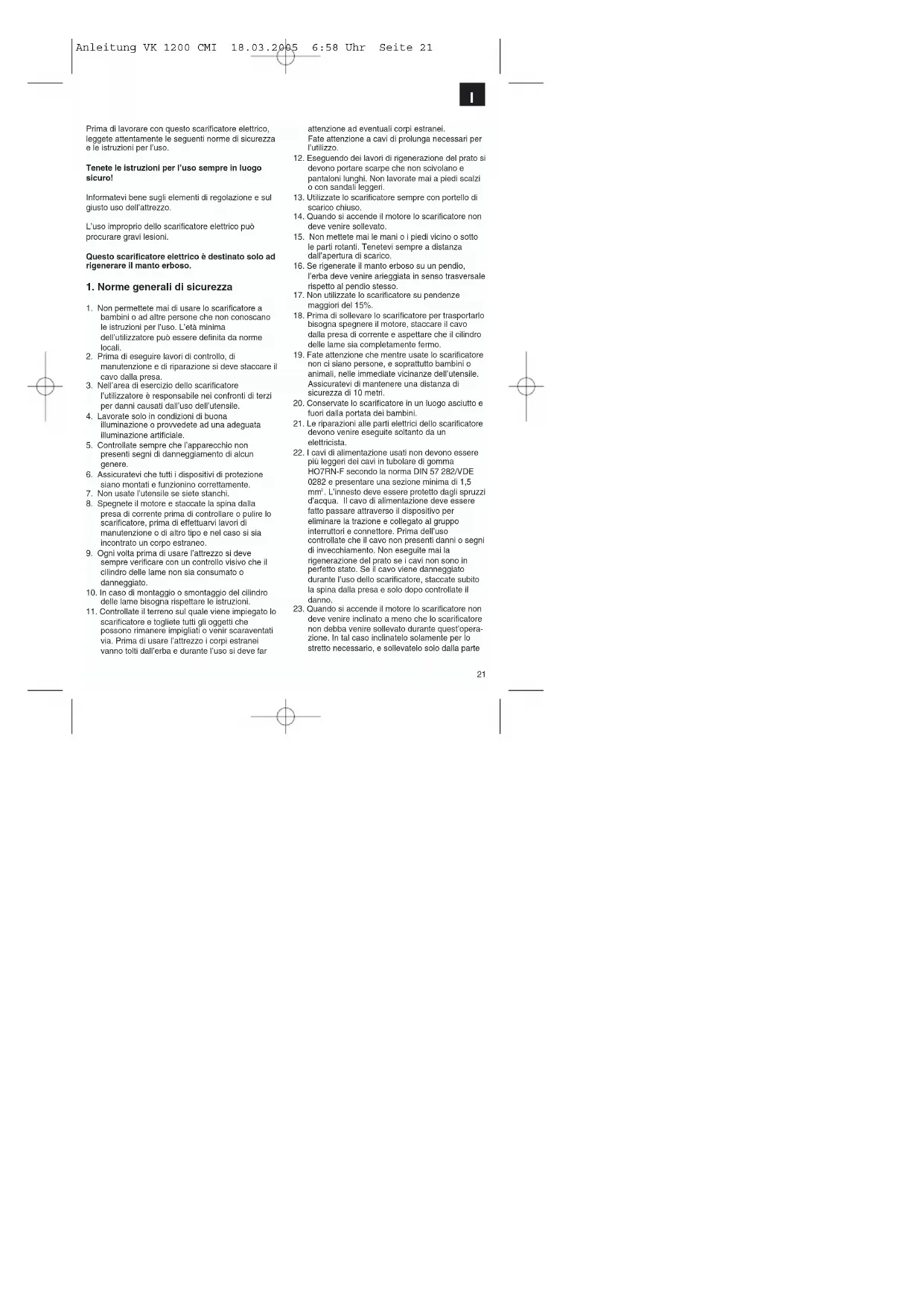 22. I cavì di alimentazione usati non devono essere più leggeri dei cavì in tubolare di gomma HO7RN-F secondo la norma DIN 57 282/VDE 0282 e presentare una sezione minima di 1,5 mm². L'innesto deve essere proietto dagli sprurzi d'accà. Il cavì di alimentazione devese fatto passareattraverso il dispositivo per eliminare la trazione e collegato al groupro interruptatori e connectore. Prima dell'uso contrrollate che il cavì non presenti dannò o segnì di invecchiamento. Non eseguite mai la rigenazione del prato se il cavì non sono in perfetto stato. Se il cavì viene danneggiato durante l'uso dello scarificatore, staccate subito la spina alla presa e solo dopo controllate il danno.