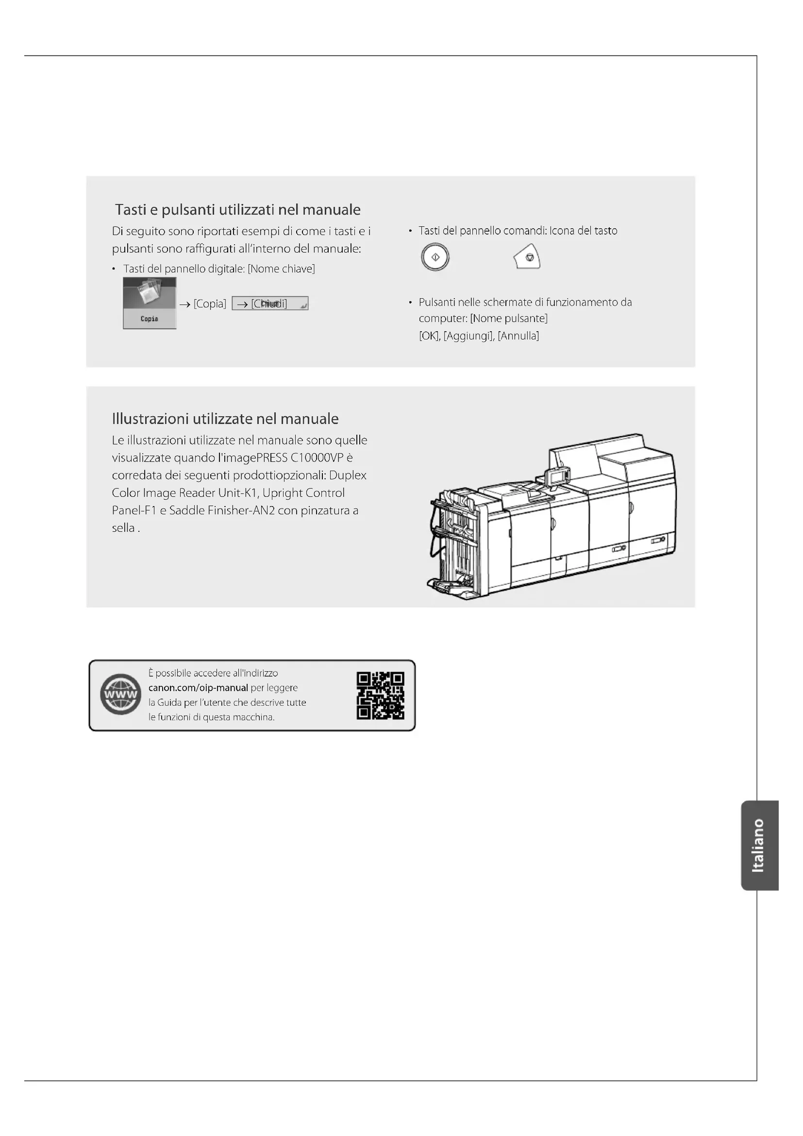 Pulsanti nelle schermate di funzionamento da computer: [Nome pulsante] [OK], [Aggiungi], [Annulla] Illustrazioni utilizzate nel manuale Le illustrazioni utilizzate nel manuale sono quelle visualizzate quando l'imagePRESS C10000VP è corredata dei seguenti prodottiopzionali: Duplex Color Image Reader Unit-K1, Upright Control Panel-F1 e Saddle Finisher-AN2 con pinzatura a sella . È possibile accedere all'indirizzo canon.com/oip-manual per leggere la Guida per l’utente che descrive tutte le funzioni di questa macchina.6 Importanti istruzioni di sicurezza Queste "Importanti istruzioni di sicurezza" hanno lo scopo di evitare che l’operatore o altre persone si feriscano durante l’uso della macchina e di evitare che vengano causati danni all’apparecchiatura. Leggerle attentamente prima di utilizzare la macchina. Inoltre, per evitare incidenti, si raccomanda di eseguire solo gli interventi e le operazioni indicate nel manuale. Un uso non corretto della macchina potrebbe causare incidenti e/o provocare danni alla macchina che potrebbero richiedere riparazioni non coperte dalla garanzia limitata fornita con la macchina.