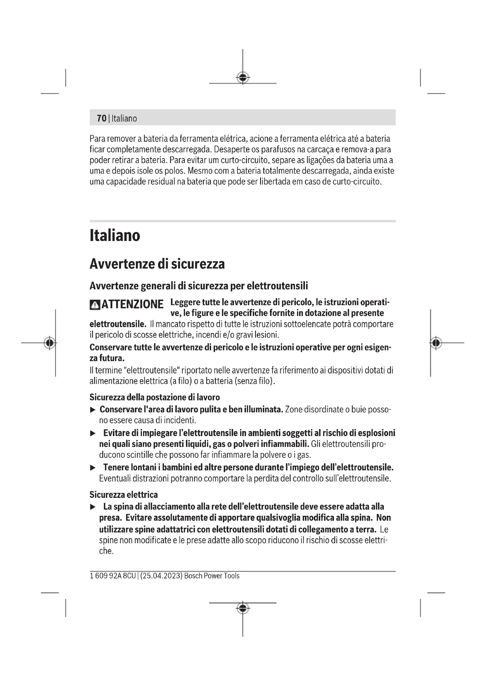 Pulverize o detergente diretamente na superfície a limpar. – Coloque primeiro a ferramenta elétrica sobre a superfície a limpar e depois ligue a ferramenta elétrica. Isto evita salpicos. – Mova a ferramenta elétrica devagar, em círculos e sem pressão sobre a superfície a limpar. Bosch Power Tools 1 609 92A 8CU | (25.04.2023)68 | Português Indicador da proteção contra sobrecarga Numa utilização correta, a ferramenta elétrica não pode ser sobrecarregada. Em caso de sobrecarga ou saída fora da faixa de temperatura permitida para a bateria, o sistema eletrónico desliga a ferramenta elétrica, até que volte a ser alcançada a temperatura ideal de funcionamento. Manutenção e assistência técnica Manutenção e limpeza u Manter a ferramenta elétrica e as aberturas de ventilação sempre limpas, para trabalhar bem e de forma segura. Se a bateria já não estiver operacional, contacte um serviço pós-venda autorizado para ferramentas elétricas Bosch. Se for necessário instalar um cabo de ligação, a instalação deve ser feita pela Bosch ou por um centro de serviço autorizado para ferramentas elétricas Bosch, para evitar perigos de segurança. – Não mergulhe a ferramenta elétrica na água ou em outros líquidos. Limpeza de acessórios e discos – Pode limpar os acessórios de limpeza e os respetivos discos na máquina de lavar loiça a uma temperatura de até 50°C. Serviço pós-venda e aconselhamento O serviço pós-venda responde às suas perguntas a respeito de serviços de reparação e de manutenção do seu produto, assim como das peças sobressalentes. Desenhos explodidos e informações acerca das peças sobressalentes também em: www.bosch- pt.com A nossa equipa de consultores Bosch esclarece com prazer todas as suas dúvidas a respeito dos nossos produtos e acessórios. Indique para todas as questões e encomendas de peças sobressalentes a referência de 10 dígitos de acordo com a placa de caraterísticas do produto. Portugal Robert Bosch LDA Avenida Infante D. Henrique Lotes 2E – 3E 1800 Lisboa Para efetuar o seu pedido online de peças entre na página www.ferramentasbosch.com. 1 609 92A 8CU | (25.04.2023) Bosch Power ToolsPortuguês | 69 Tel.: 21 8500000 Fax: 21 8511096 Encontra outros endereços da assistência técnica em: www.bosch-pt.com/serviceaddresses Transporte As baterias de iões de lítio, contidas, estão sujeitas ao direito de materiais perigosos. As baterias podem ser transportadas na rua pelo utilizador, sem mais obrigações. Na expedição por terceiros (porex: transporte aéreo ou expedição), devem ser observadas as especiais exigências quanto à embalagem e à designação. Neste caso é necessário consultar um especialista de materiais perigosos ao preparar a peça a ser trabalhada. Eliminação As ferramentas elétricas, as baterias, os acessórios e as embalagens devem ser enviados a uma reciclagem ecológica de matéria prima. Não deitar ferramentas elétricas e baterias/pilhas no lixo doméstico! Apenas para países da UE: Conforme a Diretiva Europeia 2012/19/UE relativa aos resíduos de equipamentos elétricos e eletrónicos e a sua implementação na legislação nacional, é necessário recolher separadamente as ferramentas elétricas que já não são usadas e, de acordo com a Diretiva Europeia 2006/66/CE, as baterias/pilhas defeituosas e encaminhá-las para uma reciclagem ecológica. No caso de uma eliminação incorreta, os aparelhos elétricos e eletrónicos antigos podem ter efeitos nocivos no ambiente e na saúda humada devido à possível presença de substâncias perigosas. Baterias/pilhas: Lítio: Observar as indicações no capítulo Transporte (ver "Transporte", Página69). u As baterias integradas só podem ser retiradas por pessoal especializado para serem eliminadas. A abertura da carcaça pode causar a destruição da ferramenta elétrica. Bosch Power Tools 1 609 92A 8CU | (25.04.2023)70 | Italiano Para remover a bateria da ferramenta elétrica, acione a ferramenta elétrica até a bateria ficar completamente descarregada. Desaperte os parafusos na carcaça e remova-a para poder retirar a bateria. Para evitar um curto-circuito, separe as ligações da bateria uma a uma e depois isole os polos. Mesmo com a bateria totalmente descarregada, ainda existe uma capacidade residual na bateria que pode ser libertada em caso de curto-circuito. Italiano Avvertenze di sicurezza Avvertenze generali di sicurezza per elettroutensili ATTENZIONE Leggere tutte le avvertenze di pericolo, le istruzioni operati- ve, le figure e le specifiche fornite in dotazione al presente elettroutensile. Il mancato rispetto di tutte le istruzioni sottoelencate potrà comportare il pericolo di scosse elettriche, incendi e/o gravi lesioni. Conservare tutte le avvertenze di pericolo e le istruzioni operative per ogni esigen- za futura. Il termine "elettroutensile" riportato nelle avvertenze fa riferimento ai dispositivi dotati di alimentazione elettrica (a filo) o a batteria (senza filo). Sicurezza della postazione di lavoro u Conservare l'area di lavoro pulita e ben illuminata. Zone disordinate o buie posso- no essere causa di incidenti. u Evitare di impiegare l’elettroutensile in ambienti soggetti al rischio di esplosioni nei quali siano presenti liquidi, gas o polveri infiammabili. Gli elettroutensili pro- ducono scintille che possono far infiammare la polvere o i gas. u Tenere lontani i bambini ed altre persone durante l’impiego dell’elettroutensile. Eventuali distrazioni potranno comportare la perdita del controllo sull’elettroutensile. Sicurezza elettrica u La spina di allacciamento alla rete dell’elettroutensile deve essere adatta alla presa. Evitare assolutamente di apportare qualsivoglia modifica alla spina. Non utilizzare spine adattatrici con elettroutensili dotati di collegamento a terra. Le spine non modificate e le prese adatte allo scopo riducono il rischio di scosse elettri- che. 1 609 92A 8CU | (25.04.2023)