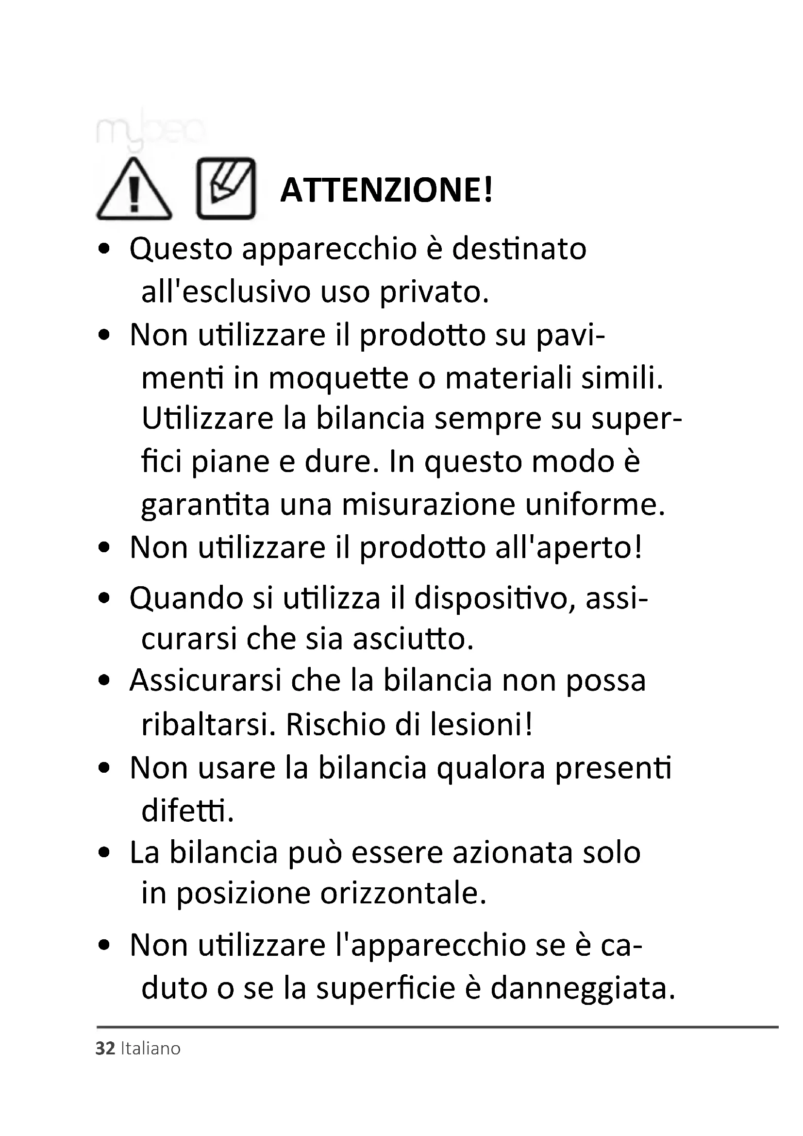 - Non utilizzato il prodotto su pavimenti in moquette o materiali simili. Utilizzato la bilancia sempre su superfici piane e dure. In quello modo è garantità una misurazione uniforme.