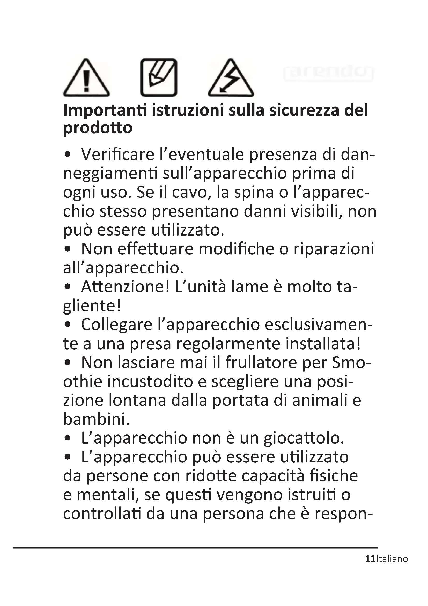 Grazie per aver scelto un prodotto di Arendo. Per utilizzare con soddisfazione l'apparecchio acquistato, si prega di leggere attentamente le seguenti brevi istruzioni per l'uso.