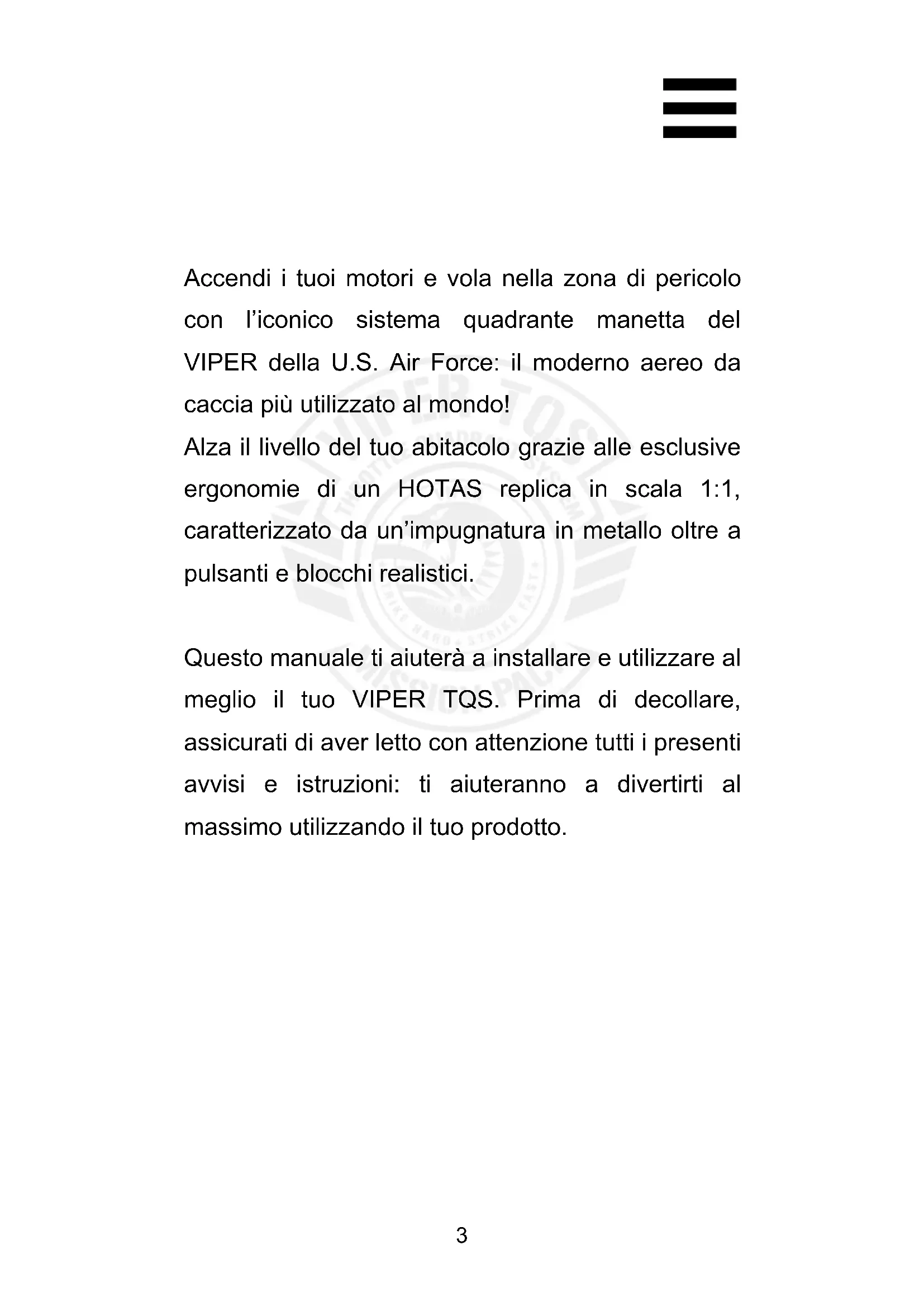 Accendi i tuoi motori e vola nella zona di pericolo con l’iconico sistema quadrante manetta del VIPER della U.S. Air Force: il moderno aereo da caccia più utilizzato al mondo! Alza il livello del tuo abitacolo grazie alle esclusive ergonomie di un HOTAS replica in scala 1:1, caratterizzato da un’impugnatura in metallo oltre a pulsanti e blocchi realistici. Questo manuale ti aiuterà a installare e utilizzare al meglio il tuo VIPER TQS. Prima di decollare, assicurati di aver letto con attenzione tutti i presenti avvisi e istruzioni: ti aiuteranno a divertirti al massimo utilizzando il tuo prodotto.4