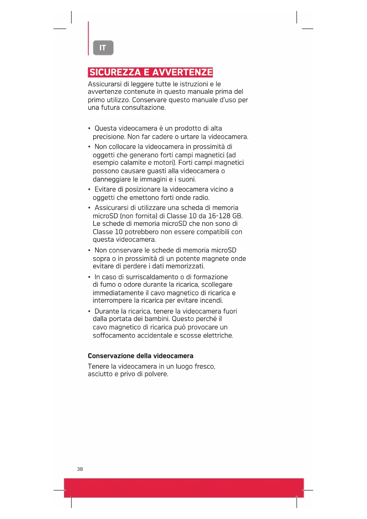 - Durante la ricarica, tenere la videocamera fuori alla portata dei bambini. Questo perché il cavo magnetico di ricarica può provocare un soffocamento accidentale e scisse elettriche.