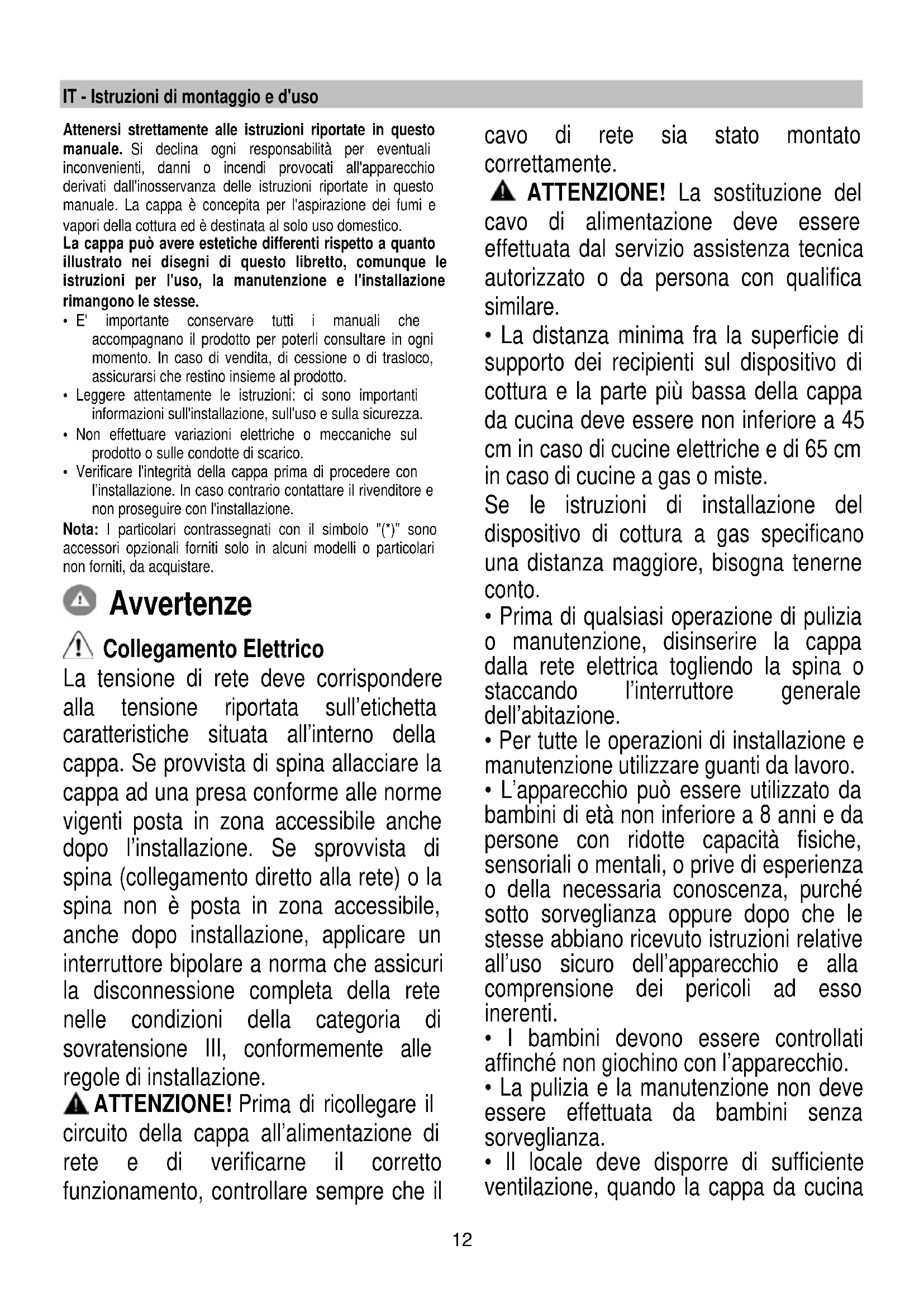 - Prima di qualsiasi operazione di pulizia o manutenzione, disinserire la cappa dalla rete elettrica togliendo la spina o staccando l’interruttore generale dell’abitazione.