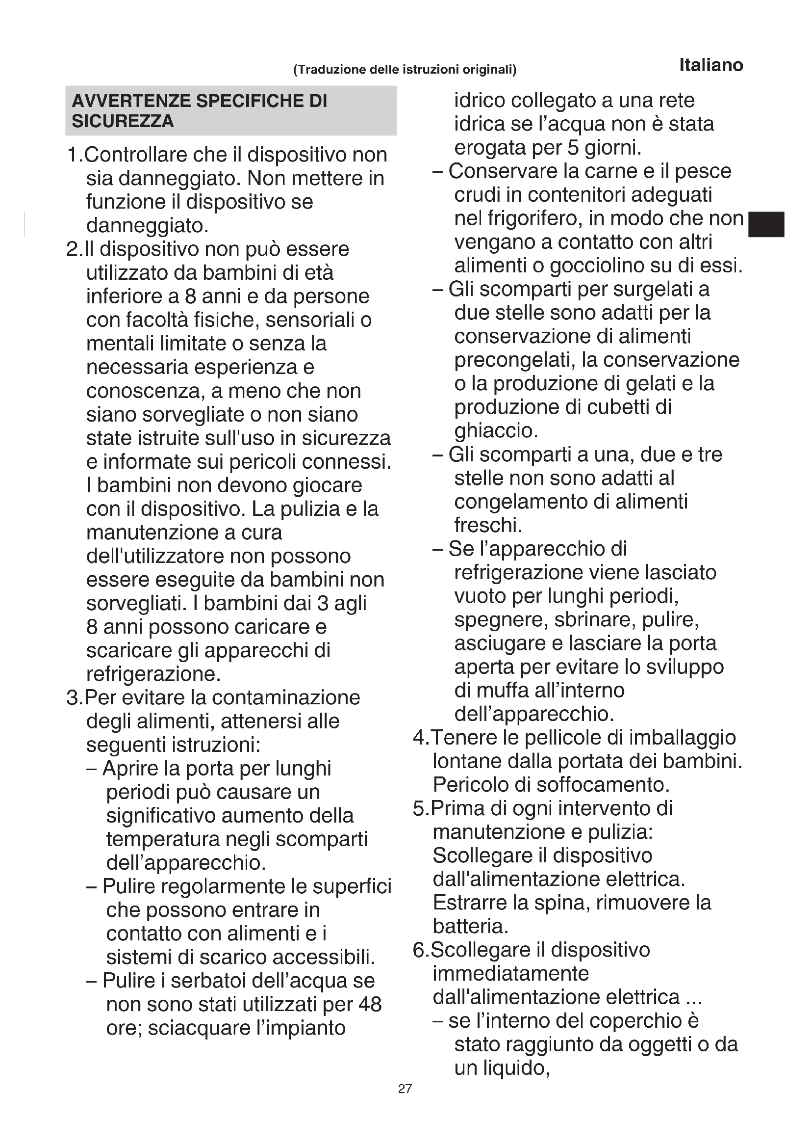 Il dispositivo non può essere utilizzato da bambini di età inferiore a 8 anni e da persone con facoltà fisiche, sensoriali o mentali limitate o senza la necessaria esperienza e conoscenza, a meno che non siano sorvegliate o non siano state istruite sull'uso in sicurezza e informate sui pericoli connessi. I bambini non devono giocare con il dispositivo. La pulizia e la manutenzione a cura dell'utilizzatore non possono essere eseguite da bambini non sorvegliati. I bambini dai 3agli 8 anni possono caricare e scaricare gli appearecchi di refrigerazione.