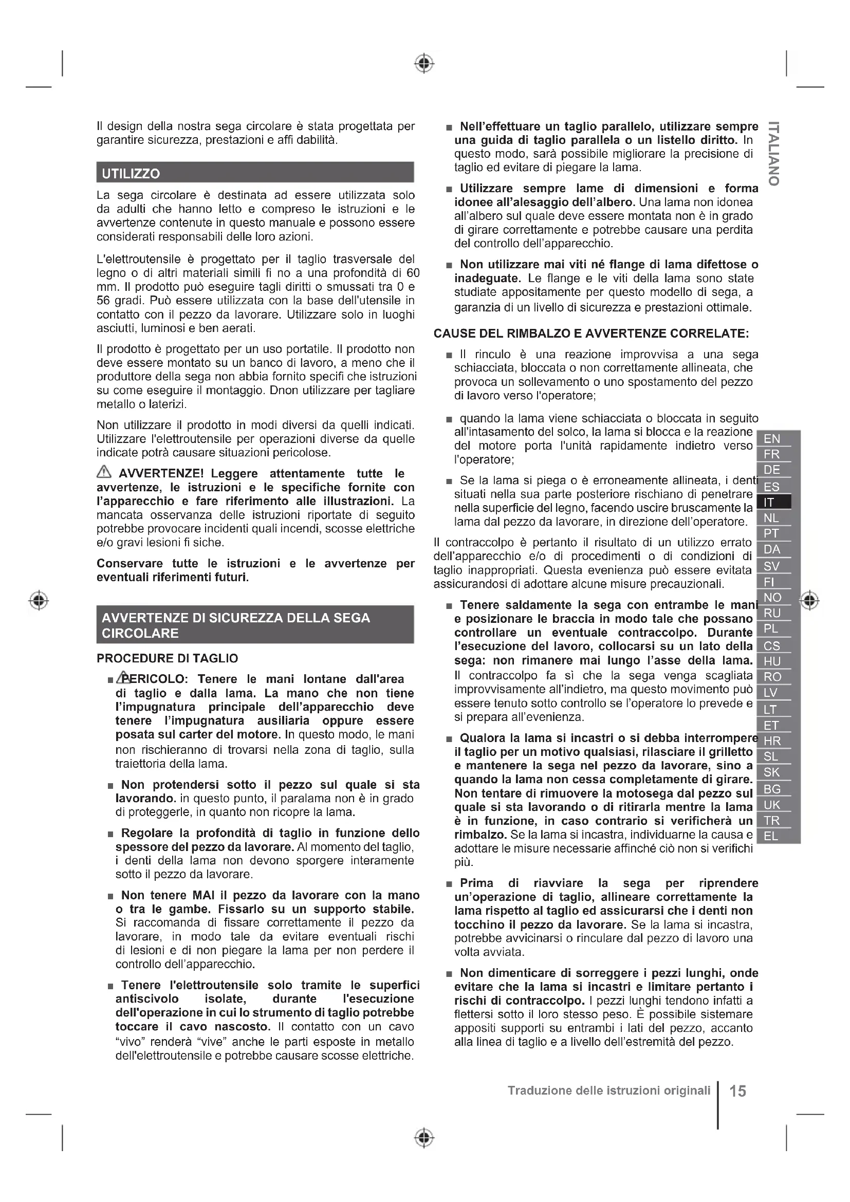 ■ PERICOLO: Tenere le mani lontane dall'area di taglio e dalla lama. La mano che non tiene l’impugnatura principale dell’apparecchio deve tenere l’impugnatura ausiliaria oppure essere posata sul carter del motore. In questo modo, le mani non rischieranno di trovarsi nella zona di taglio, sulla traiettoria della lama. ■ Non protendersi sotto il pezzo sul quale si sta lavorando. in questo punto, il paralama non è in grado di proteggerle, in quanto non ricopre la lama. ■ Regolare la profondità di taglio in funzione dello spessore del pezzo da lavorare. Al momento del taglio, i denti della lama non devono sporgere interamente sotto il pezzo da lavorare. ■ Non tenere MAI il pezzo da lavorare con la mano o tra le gambe. Fissarlo su un supporto stabile. Si raccomanda di fissare correttamente il pezzo da lavorare, in modo tale da evitare eventuali rischi di lesioni e di non piegare la lama per non perdere il controllo dell’apparecchio. ■ Tenere l'elettroutensile solo tramite le superfici antiscivolo isolate, durante l'esecuzione dell'operazione in cui lo strumento di taglio potrebbe toccare il cavo nascosto. Il contatto con un cavo “vivo” renderà “vive” anche le parti esposte in metallo dell'elettroutensile e potrebbe causare scosse elettriche. ■ Nell’effettuare un taglio parallelo, utilizzare sempre una guida di taglio parallela o un listello diritto. In questo modo, sarà possibile migliorare la precisione di taglio ed evitare di piegare la lama. ■ Utilizzare sempre lame di dimensioni e forma idonee all’alesaggio dell’albero. Una lama non idonea all’albero sul quale deve essere montata non è in grado di girare correttamente e potrebbe causare una perdita del controllo dell’apparecchio. ■ Non utilizzare mai viti né flange di lama difettose o inadeguate. Le flange e le viti della lama sono state studiate appositamente per questo modello di sega, a garanzia di un livello di sicurezza e prestazioni ottimale. CAUSE DEL RIMBALZO E AVVERTENZE CORRELATE: ■ Il rinculo è una reazione improvvisa a una sega schiacciata, bloccata o non correttamente allineata, che provoca un sollevamento o uno spostamento del pezzo di lavoro verso l'operatore; ■ quando la lama viene schiacciata o bloccata in seguito all'intasamento del solco, la lama si blocca e la reazione del motore porta l'unità rapidamente indietro verso l'operatore; ■ Se la lama si piega o è erroneamente allineata, i denti situati nella sua parte posteriore rischiano di penetrare nella superficie del legno, facendo uscire bruscamente la lama dal pezzo da lavorare, in direzione dell’operatore. Il contraccolpo è pertanto il risultato di un utilizzo errato dell’apparecchio e/o di procedimenti o di condizioni di taglio inappropriati. Questa evenienza può essere evitata assicurandosi di adottare alcune misure precauzionali. ■ Tenere saldamente la sega con entrambe le mani e posizionare le braccia in modo tale che possano controllare un eventuale contraccolpo. Durante l’esecuzione del lavoro, collocarsi su un lato della sega: non rimanere mai lungo l’asse della lama. Il contraccolpo fa sì che la sega venga scagliata improvvisamente all’indietro, ma questo movimento può essere tenuto sotto controllo se l’operatore lo prevede e si prepara all’evenienza. ■ Qualora la lama si incastri o si debba interrompere il taglio per un motivo qualsiasi, rilasciare il grilletto e mantenere la sega nel pezzo da lavorare, sino a quando la lama non cessa completamente di girare. Non tentare di rimuovere la motosega dal pezzo sul quale si sta lavorando o di ritirarla mentre la lama è in funzione, in caso contrario si verificherà un rimbalzo. Se la lama si incastra, individuarne la causa e adottare le misure necessarie affinché ciò non si verifichi più. ■ Prima di riavviare la sega per riprendere un’operazione di taglio, allineare correttamente la lama rispetto al taglio ed assicurarsi che i denti non tocchino il pezzo da lavorare. Se la lama si incastra, potrebbe avvicinarsi o rinculare dal pezzo di lavoro una volta avviata. ■ Non dimenticare di sorreggere i pezzi lunghi, onde evitare che la lama si incastri e limitare pertanto i rischi di contraccolpo. I pezzi lunghi tendono infatti a flettersi sotto il loro stesso peso. È possibile sistemare appositi supporti su entrambi i lati del pezzo, accanto alla linea di taglio e a livello dell’estremità del pezzo. ITALIANO