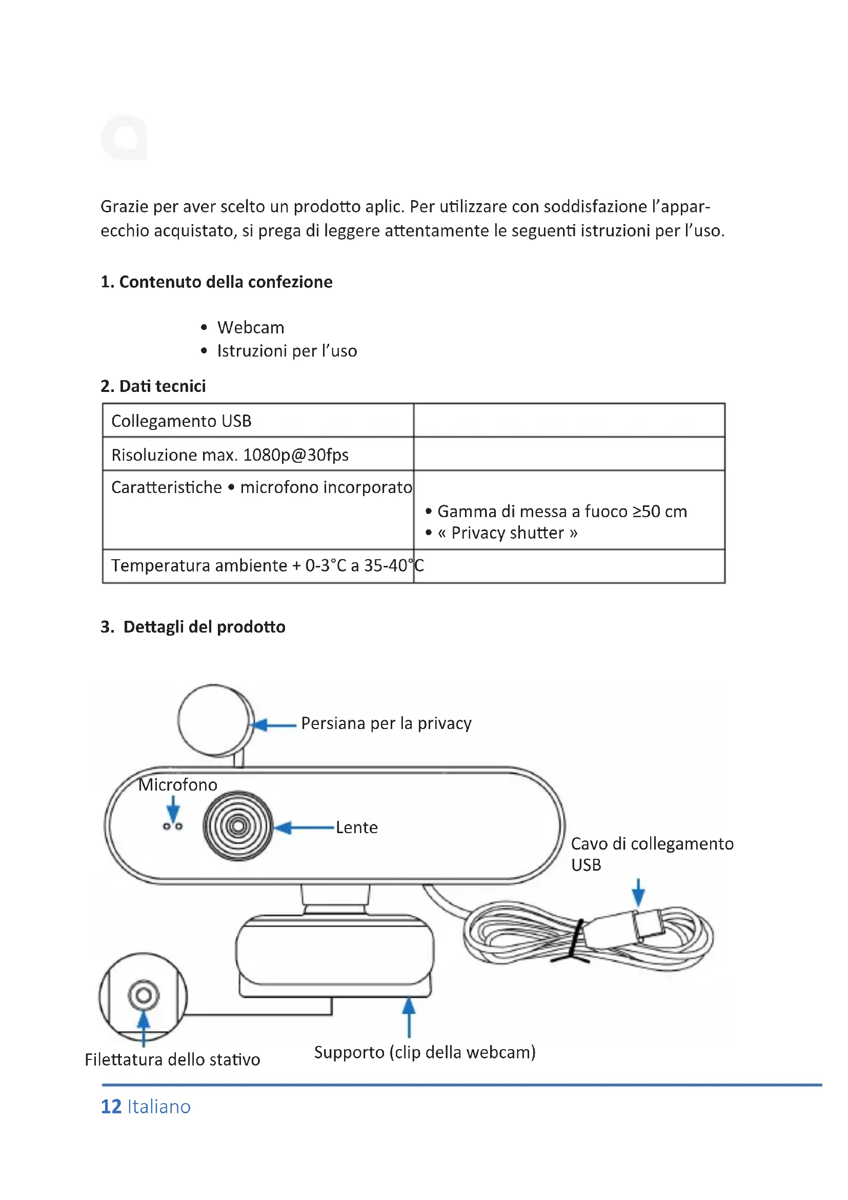 Scarica le istruzioni per il tuo Webcam in formato PDF gratuitamente! Trova il tuo manuale 305512 - Aplic e riprendi in mano il tuo dispositivo elettronico. In questa pagina sono pubblicati tutti i documenti necessari per l'utilizzo del tuo dispositivo. 305512 del marchio Aplic.