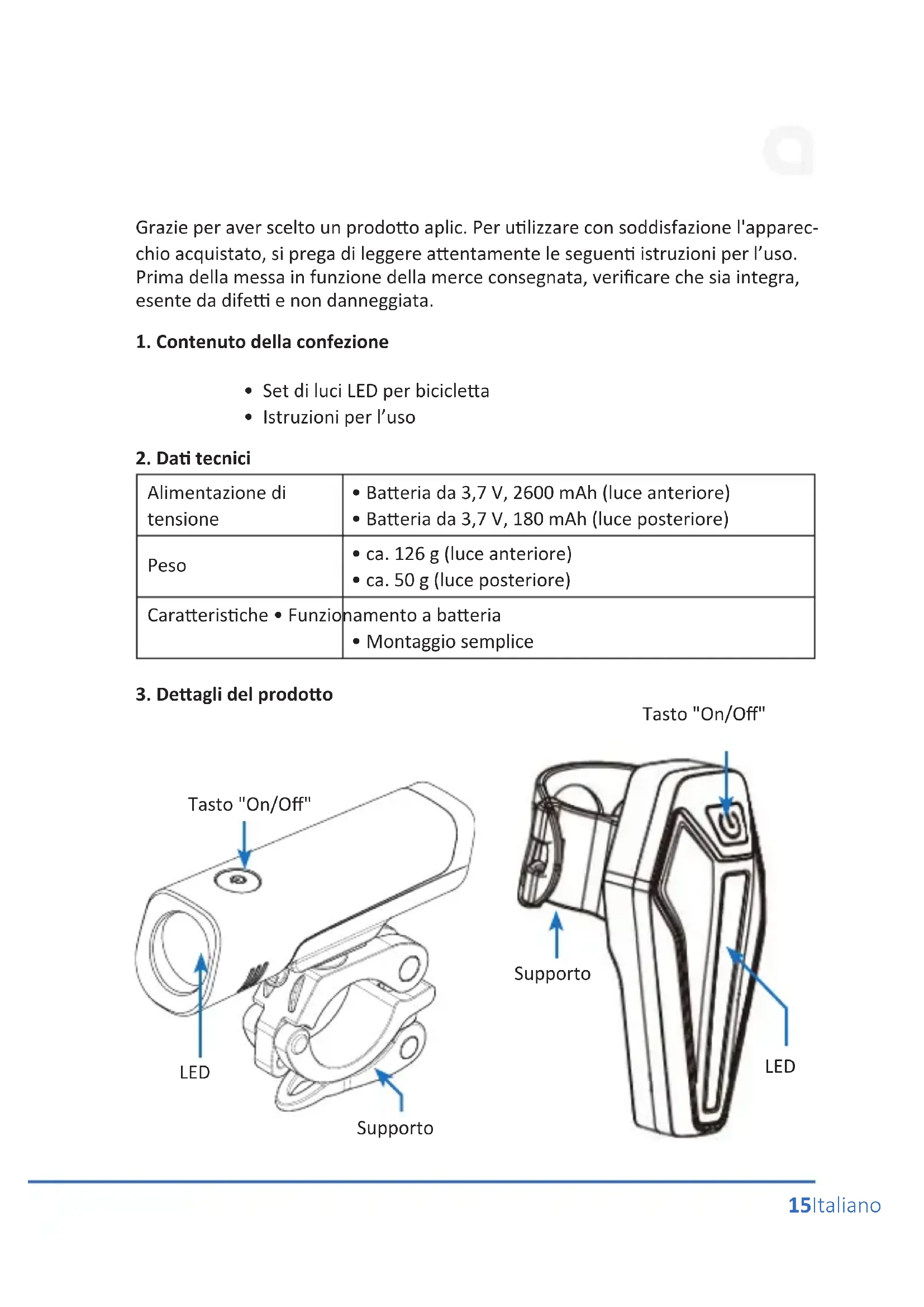 Grazie per aver scelto un prodotto aplic. Per utilizzare con soddisfazione l'apparecchio acquistato, si prega di leggere attentamente le seguenti istruzioni per l'uso. Prima della messa in funzione della merce consegnata, verificare che sia integra, esente da difetti e non danneggiata.
