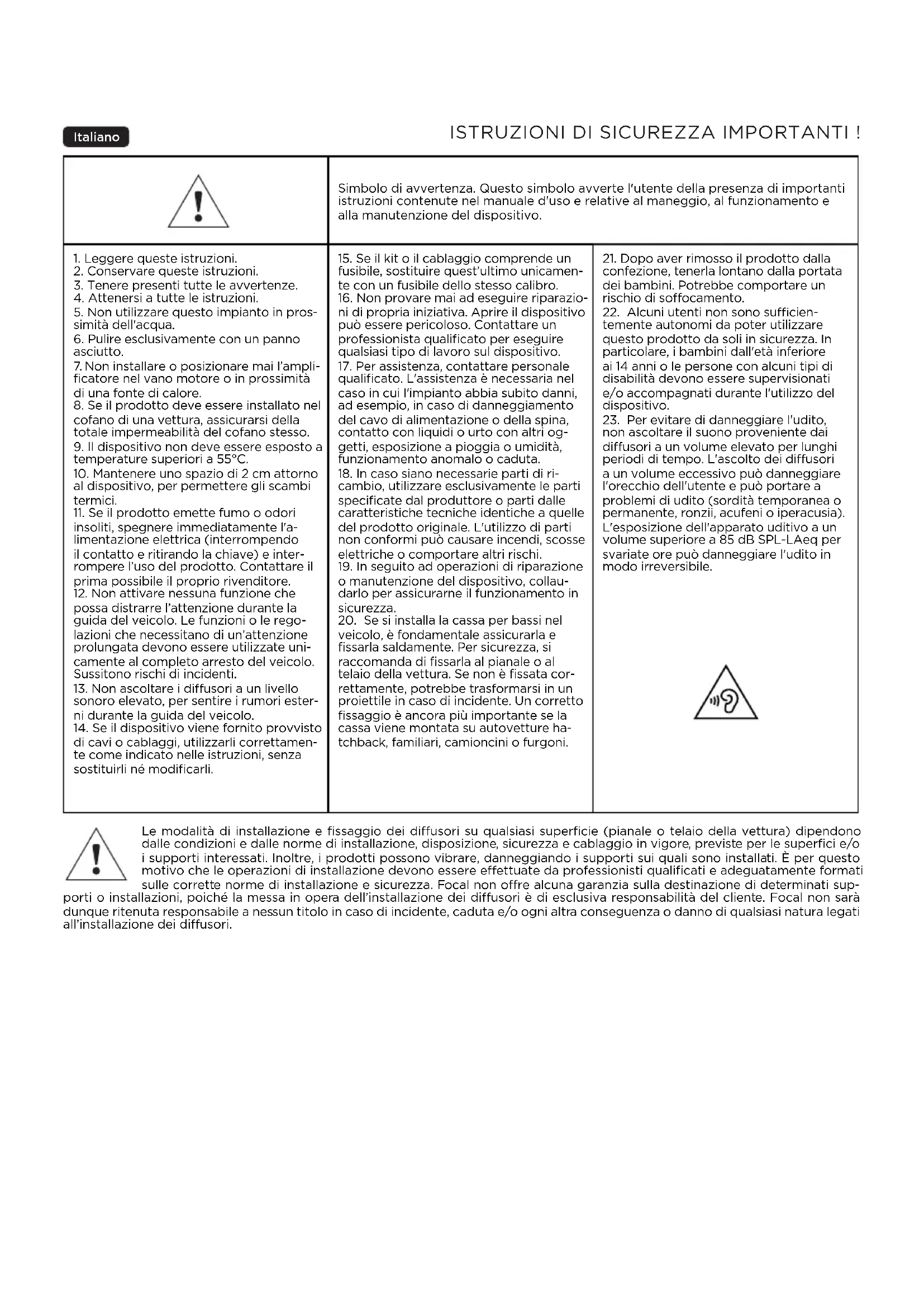 MBZ v2 Istruzioni per l'uso Periodo di rodaggio Gli altoparlanti, sono elementi meccanici complessi che richiedono un periodo di adattamento per poter funzionare al meglio delle loro possibilità. Questo periodo di rodaggio varia a seconda delle condizioni specifiche e può durare anche qualche settimana. Per velocizzare questa operazione, si consiglia di tenere in funzione gli altoparlanti per una ventina di ore, a un livello sonoro medio. Quando le caratteristiche degli altoparlanti si sono completamente stabilizzate, i prodotti offriranno le loro prestazioni ottimali. Condizioni di garanzia Tutti gli altoparlanti Focal sono coperti da garanzia emessa dal distributore ufficiale Focal del tuo paese. Il tuo distributore potrà fornirti tutti i dettagli relativi alle condizioni di garanzia. La copertura della garanzia comprende quanto concesso dalla garanzia legale in forza nel paese in cui è stata emessa la fattura d’acquisto originale.IMPORTANTES INSTRUCCIONES DE SEGURIDAD ! Español Símbolo de advertencia. Este símbolo se ha diseñado para advertir al usuario de la presencia de instrucciones importantes mencionadas en el manual de usuario y rela- cionadas con el manejo, funcionamiento y mantenimiento del dispositivo.