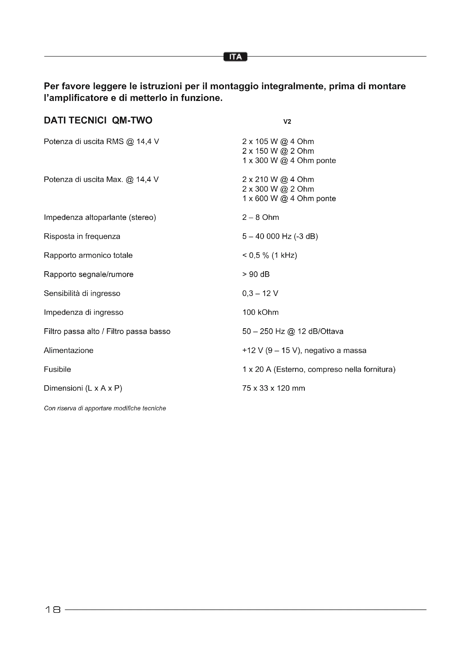 Potenza di uscita RMS @ 14,4 V Potenza di uscita Max. @ 14,4 V Impedenza altoparlante (stereo) Risposta in frequenza Rapporto armonico totale Rapporto segnale/rumore Sensibilità di ingresso Impedenza di ingresso Filtro passa alto / Filtro passa basso Alimentazione Fusibile Dimensioni (L x A x P) 2 x 105 W @ 4 Ohm 2 x 150 W @ 2 Ohm 1 x 300 W @ 4 Ohm ponte 2 x 210 W @ 4 Ohm 2 x 300 W @ 2 Ohm 1 x 600 W @ 4 Ohm ponte 2 – 8 Ohm 5 – 40 000 Hz (-3 dB) < 0,5 % (1 kHz) > 90 dB 0,3 – 12 V 100 kOhm 50 – 250 Hz @ 12 dB/Ottava +12 V (9 – 15 V), negativo a massa 1 x 20 A (Esterno, compreso nella fornitura) 75 x 33 x 120 mm Con riserva di apportare modiche tecniche19