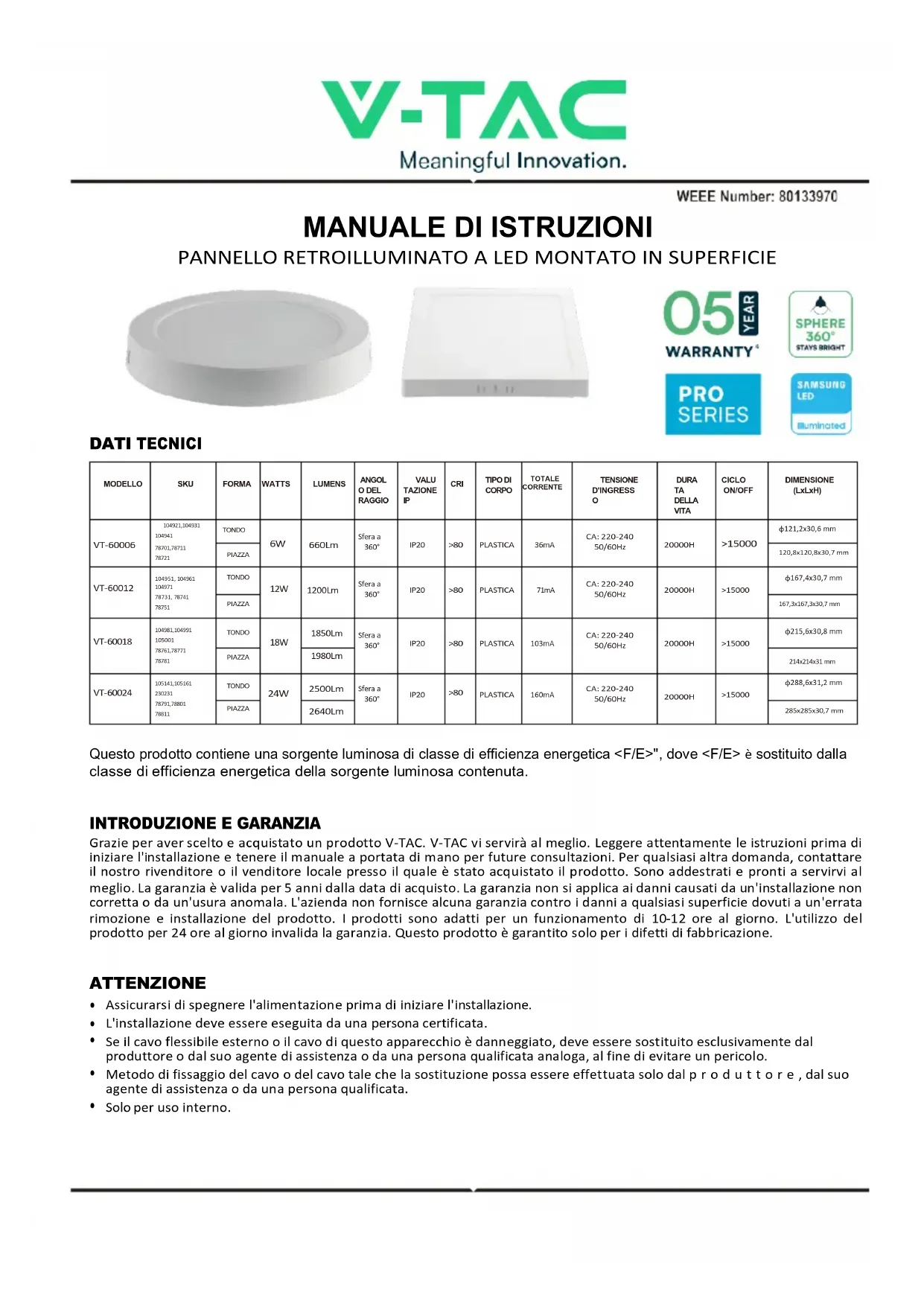 Grazie per aver scelto e acquistato un prodotto V-TAC. V-TAC vi servirà al meglio. Leggere attentamente le istruzioni prima di iniziare l'installazione e tenere il manuale a portata di mano per future consultazioni. Per qualsiasi altra domanda, contattare il nostro rivenditore o il venditore locale presso il quale è stato acquistato il prodotto. Sono addestrati e pronti a servirvi al meglio. La garanzia è valida per 5 anni dalla data di acquisto. La garanzia non si applica ai danni causati da un'installazione non corretta o da un'usura anomala. L'azienda non fornisce alcuna garanzia contro i danni a qualsiasi superficie dovuti a un'errata rimozione e installazione del prodotto. I prodotti sono adatti per un funzionamento di 10-12 ore al giorno. L'utilizzo del prodotto per 24 ore al giorno invalida la garanzia. Questo prodotto è garantito solo per i difetti di fabbricazione.