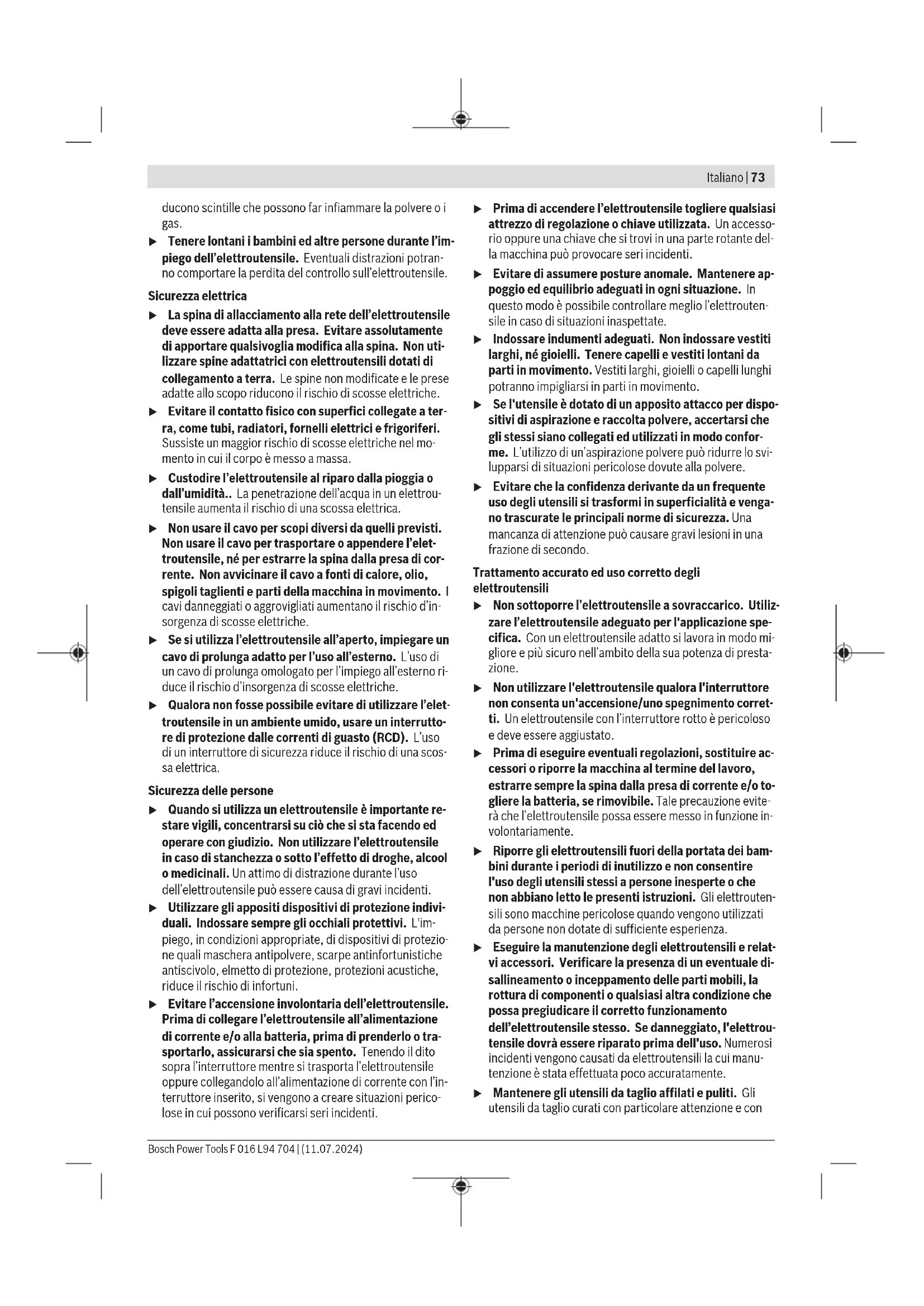 – Gli utenti che utilizzano la sega per la prima volta dovreb- bero far pratica nel taglio di tronchi su un cavalletto per segare. – Con sega spenta adottare una posizione di lavoro corretta davanti al legno. – Avviare la sega a catena ed assicurarsi che la catena della sega abbia raggiunto la velocità massima prima che la stessa venga a contatto con il legno. – Iniziare con il taglio premendo i denti a presa mordente (9) contro il legno per stabilizzare il taglio. – Utilizzare i denti a presa mordente come leva in caso di ta- glio di tronchi più robusti o tronchi di alberi spostando in- dietro in modo graduale, durante il taglio, i denti a presa mordente su un punto più basso. Allo scopo tirare legger- mente indietro la sega a catena fino a quando i denti a presa mordente si staccano e posizionare di nuovo la sega a catena su un piano più basso per continuare a tagliare. Non estrarre completamente la sega a catena dal taglio. – Lasciare in funzione la sega a catena durante l'intero ta- glio e mantenere una velocità costante. – Durante l'operazione di taglio non premere con forza sulla catena della sega ma lasciarla lavorare. – Rimuovere sempre la sega a catena dal taglio nel legno mentre la catena della sega è in funzione. – Prestare attenzione alla fine del taglio. Non appena la se- ga a catena avrà completato il taglio, cambierà improvvi- samente il peso. Esiste pericolo di lesioni per gambe e piedi. – Rilasciare l'interruttore di avvio/arresto non appena il ta- glio è terminato in modo tale che la catena si arresti e por- Bosch Power Tools F 016 L94 704 | (11.07.2024)82 | Italiano tare correttamente il frenacatena (5) in posizione O (vedi figura E1). Contraccolpo della sega (vedi figura G) Con una conoscenza di base del contraccolpo è possibile ri- durre la comparsa di contraccolpi che possono causare inci- denti. Prestare sempre attenzione a posizionarsi saldamente sul terreno ed a mantenere l'equilibrio. Per contraccolpo della sega si intende un improvviso con- traccolpo all’indietro oppure verso l’alto della sega a catena che si verifica mentre la sega è in funzione e che può essere provocato dal contatto della punta della sega con il materiale da tagliare oppure in caso di catena bloccata. Quando si verifica un contraccolpo, la sega a catena reagisce in modo imprevedibile e può provocare gravi lesioni all’ope- ratore oppure alle persone che si trovano nella zona operati- va. Prestare particolare attenzione al taglio in direzioni laterali e oblique nonché ai tagli longitudinali. Normalmente in questi tagli non possono essere impiegati i denti a presa mordente (9). Osservare le seguenti misure precauzionali per ridurre al mi- nimo il contraccolpo: – Prestare sempre attenzione all'utilizzo corretto della sega a catena. – Impugnare saldamente la sega a catena e tenere rigido il braccio sinistro per mantenere il controllo sulla sega a ca- tena qualora si verificasse un contraccolpo. – Assicurarsi che l'area in cui si effettuano le operazioni di taglio sia libera da ostacoli. Prestare attenzione che il na- sello della lama non venga a contatto con un tronco d'al- bero, un ramo, una recinzione o un altro ostacolo che si potrebbe incontrare durante il lavoro con la sega. Nota: Se la punta della lama venisse in contatto con un osta- colo potrebbe verificarsi un contraccolpo. – Tagliare sempre con la velocità massima della sega a cate- na. Premere a fondo l'interruttore di avvio/arresto (2) e mantenere una velocità di taglio costante. – Utilizzare esclusivamente lame di ricambio e catene a bas- so contraccolpo raccomandate dalla Bosch. Frenacatena Il frenacatena è un meccanismo di sicurezza che viene attiva- to tramite il polso sopra alla leva per l'attivazione del frenaca- tena (5) alla comparsa di un contraccolpo. La catena della sega si arresta immediatamente. In questo modo viene ridot- to il pericolo di lesioni causato dal contraccolpo. Verificare regolarmente se il frenacatena funziona: – Tenere saldamente con entrambe le mani la sega a cate- na. – Accendere la sega a catena. – Quando la catena della sega ruota, premere in avanti la le- va con il polso per attivare il frenacatena (5). Non utilizza- re la sega a catena se la catena della sega durante questo test non si arresta immediatamente. Nota: Durante il normale utilizzo non arrestare la sega a cate- na tramite l'azionamento intenzionale della leva per il frena- catena (5). Taglio di tronchi (vedi figura H) – Prima del taglio assicurare sempre i tronchi. – Tagliare i tronchi sempre al di fuori dei punti assicurati per impedire che il tronco si pieghi e la catena rimanga in- castrata. – Prestare attenzione che la catena della sega non venga mai a contato con il terreno o l'equipaggiamento di taglio. – Prestare attenzione ad non inciampare su resti di tronchi d'alberi, rami, radici ecc. Taglio di legname sotto tensione (vedi figura I) – Il taglio di legname, rami oppure alberi che si trovano sot- to tensione dovrebbe essere effettuato esclusivamente da personale specializzato appositamente addestrato. In questi casi è importante operare con la massima attenzio- ne. Esiste elevato pericolo di incidenti. Sramatura di un ramo o di un albero (vedi figura