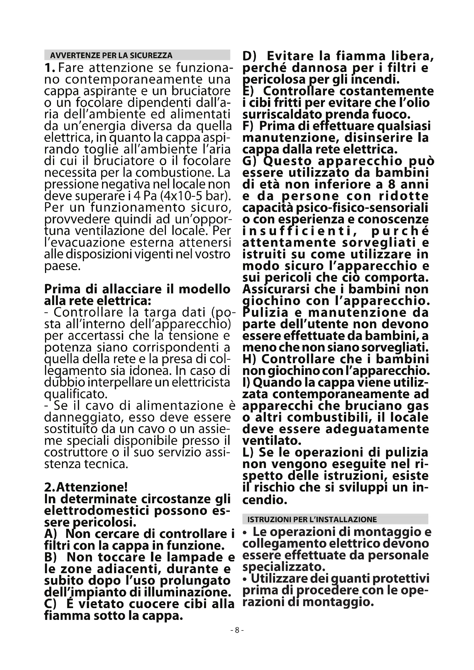 In determinate circostanze gli elettrodomestici possono es- sere pericolosi. A) Non cercare di controllare i filtri con la cappa in funzione. B) Non toccare le lampade e le zone adiacenti, durante e subito dopo l’uso prolungato dell’impianto di illuminazione. C) É vietato cuocere cibi alla fiamma sotto la cappa. D) Evitare la fiamma libera, perché dannosa per i filtri e pericolosa per gli incendi. E) Controllare costantemente i cibi fritti per evitare che l’olio surriscaldato prenda fuoco. F) Prima di effettuare qualsiasi manutenzione, disinserire la cappa dalla rete elettrica. G) Questo apparecchio può essere utilizzato da bambini di età non inferiore a 8 anni e da persone con ridotte capacità psico-fisico-sensoriali o con esperienza e conoscenze insufficienti, purché attentamente sorvegliati e istruiti su come utilizzare in modo sicuro l’apparecchio e sui pericoli che ciò comporta. Assicurarsi che i bambini non giochino con l’apparecchio. Pulizia e manutenzione da parte dell’utente non devono essere effettuate da bambini, a meno che non siano sorvegliati. H) Controllare che i bambini non giochino con l’apparecchio.