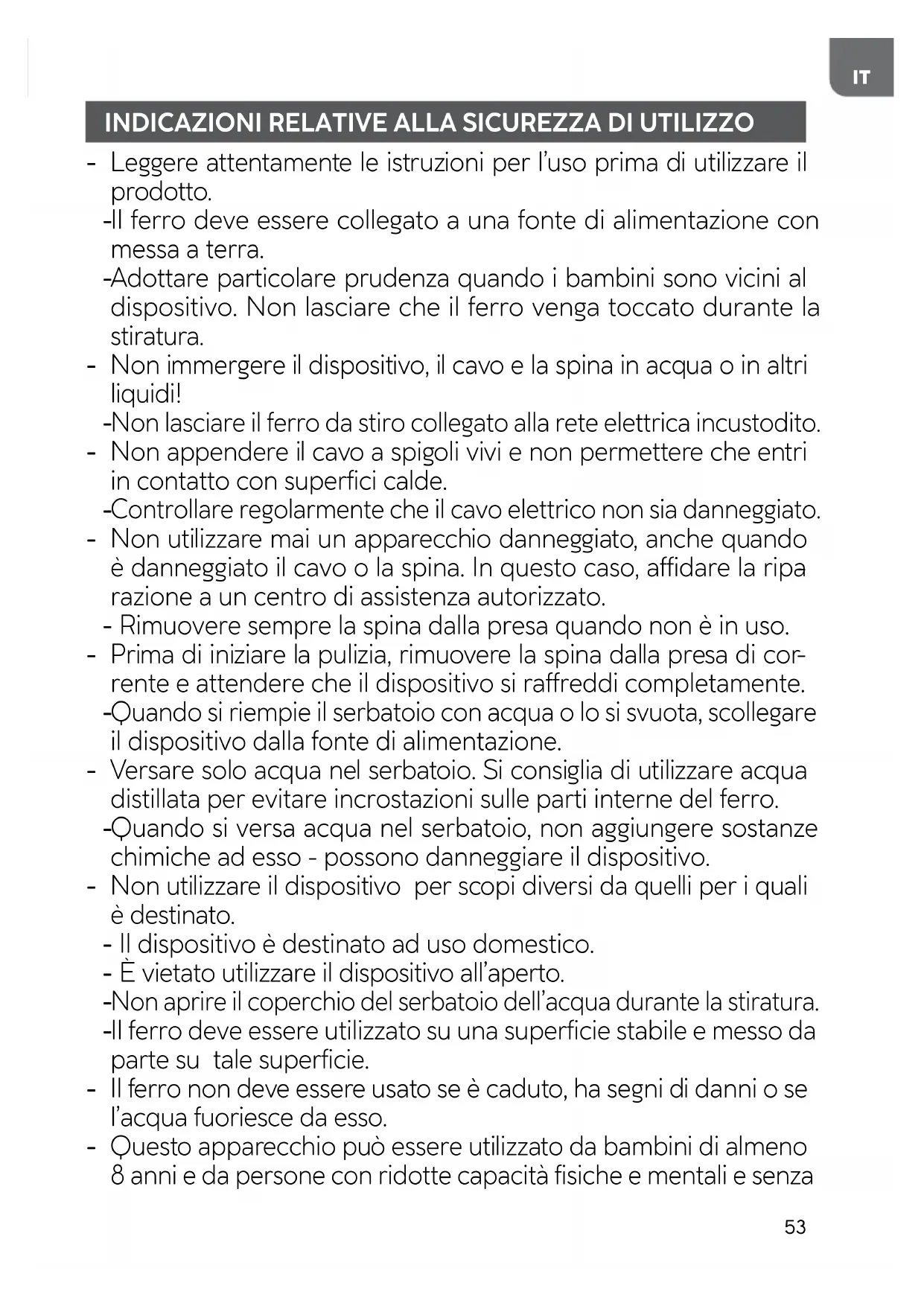 Il ferro deve essere utilizzato su una superficie stabile e messo da parte su tale superficie. - Il ferro non deve essere usato se è caduto, ha segni di danni o se l’acqua fuoriesce da esso. - Questo apparecchio può essere utilizzato da bambini di almeno 8 anni e da persone con ridotte capacità fisiche e mentali e senza54