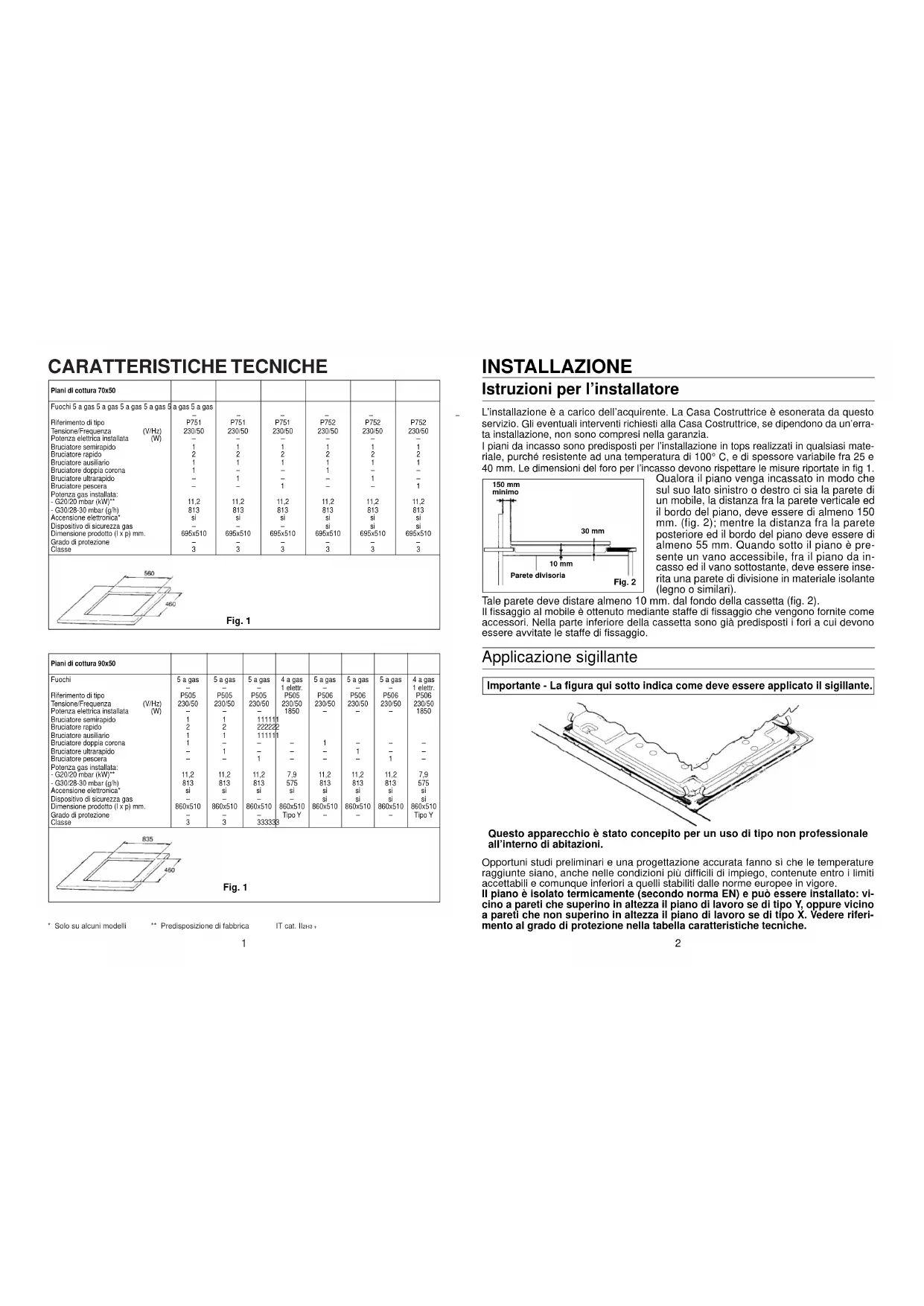 - Solo su alcuni modelli ** Predisposizione di fabbrica IT cat. II2H3 + Piani di cottura 70x50Fuochi 5 a gas 5 a gas 5 a gas 5 a gas 5 a gas 5 a gas––––– – Riferimento di tipo P751 P751 P751 P752 P752 P752 Tensione/Frequenza (V/Hz) 230/50 230/50 230/50 230/50 230/50 230/50 Potenza elettrica installata (W) – – – – – – Bruciatore semirapido 1 1 1 1 1 1 Bruciatore rapido 2 2 2 2 2 2 Bruciatore ausiliario 1 1 1 1 1 1 Bruciatore doppia corona 1 – – 1 – – Bruciatore ultrarapido – 1 – – 1 – Bruciatore pescera – – 1 – – 1 Potenza gas installata: - G20/20 mbar (kW)** 11,2 11,2 11,2 11,2 11,2 11,2 - G30/28-30 mbar (g/h) 813 813 813 813 813 813 Accensione elettronica* si si si si si si Dispositivo di sicurezza gas – – – si si si Dimensione prodotto (l x p) mm. 695x510 695x510 695x510 695x510 695x510 695x510 Grado di protezione – – – – – – Classe 3 3 3 3 3 3 Piani di cottura 90x50 Fuochi 5 a gas 5 a gas 5 a gas 4 a gas 5 a gas 5 a gas 5 a gas 4 a gas – – – 1 elettr. – – – 1 elettr. Riferimento di tipo P505 P505 P505 P505 P506 P506 P506 P506 Tensione/Frequenza (V/Hz) 230/50 230/50 230/50 230/50 230/50 230/50 230/50 230/50 Potenza elettrica installata (W) – – – 1850 – – – 1850 Bruciatore semirapido 1 1 111111Bruciatore rapido 2 2 222222Bruciatore ausiliario 1 1 111111 Bruciatore doppia corona 1 – ––1––– Bruciatore ultrarapido – 1 –––1–– Bruciatore pescera – – 1–––1– Potenza gas installata: - G20/20 mbar (kW)** 11,2 11,2 11,2 7,9 11,2 11,2 11,2 7,9 - G30/28-30 mbar (g/h) 813 813 813 575 813 813 813 575 Accensione elettronica* si si si si si si si si Dispositivo di sicurezza gas – – – – si si si si Dimensione prodotto (l x p) mm. 860x510 860x510 860x510 860x510 860x510 860x510 860x510 860x510 Grado di protezione – – – Tipo Y – – – Tipo Y Classe 3 3 333333Fig. 1Fig. 1