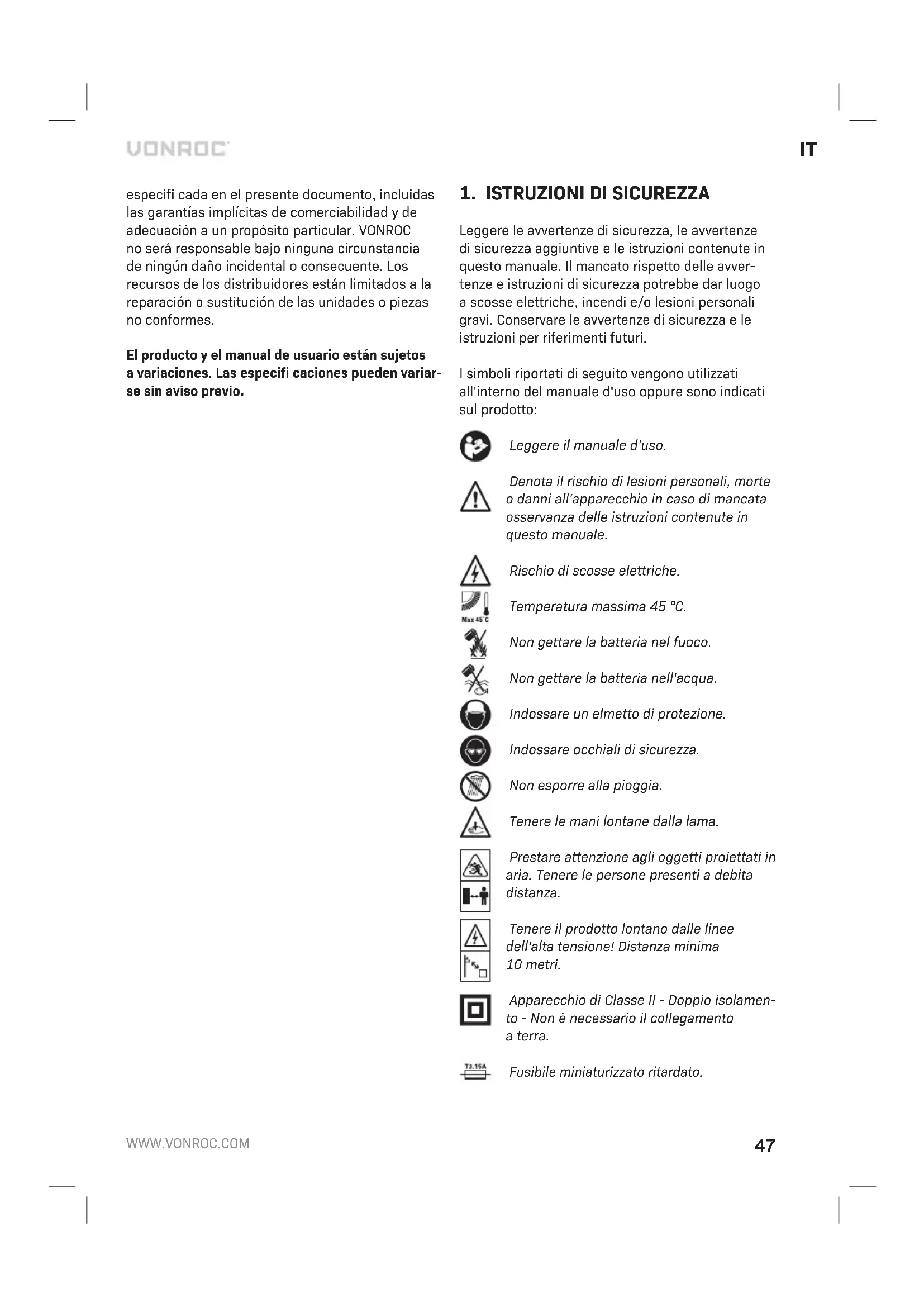 Leggere le avvertenze di sicurezza, le avvertenze di sicurezza aggiuntive ele istruzioni contenute in questo manuale. Il mancato rispetto delle avver- tenze eistruzioni di sicurezza potrebbe dar luogo ascosse elettriche, incendi e/olesioni personali gravi. Conservare le avvertenze di sicurezza ele istruzioni per riferimenti futuri. Isimboli riportati di seguito vengono utilizzati all'interno del manuale d'uso oppure sono indicati sul prodotto: Leggere il manuale d'uso. Denota il rischio di lesioni personali, morte odanni all'apparecchio in caso di mancata osservanza delle istruzioni contenute in questo manuale. Rischio di scosse elettriche. Temperatura massima 45 °C. Non gettare la batteria nel fuoco. Non gettare la batteria nell'acqua. Indossare un elmetto di protezione. Indossare occhiali di sicurezza. Non esporre alla pioggia. Tenere le mani lontane dalla lama. Prestare attenzione agli oggetti proiettati in aria. Tenere le persone presenti adebita distanza. Tenere il prodotto lontano dalle linee dell'alta tensione! Distanza minima 10metri. Apparecchio di Classe II - Doppio isolamen- to - Non è necessario il collegamento aterra. Fusibile miniaturizzato ritardato. especifi cada en el presente documento, incluidas las garantías implícitas de comerciabilidad yde adecuación aun propósito particular. VONROC no será responsable bajo ninguna circunstancia de ningún daño incidental oconsecuente. Los recursos de los distribuidores están limitados ala reparación osustitución de las unidades opiezas no conformes. El producto yel manual de usuario están sujetos avariaciones. Las especifi caciones pueden variar- se sin aviso previo.48