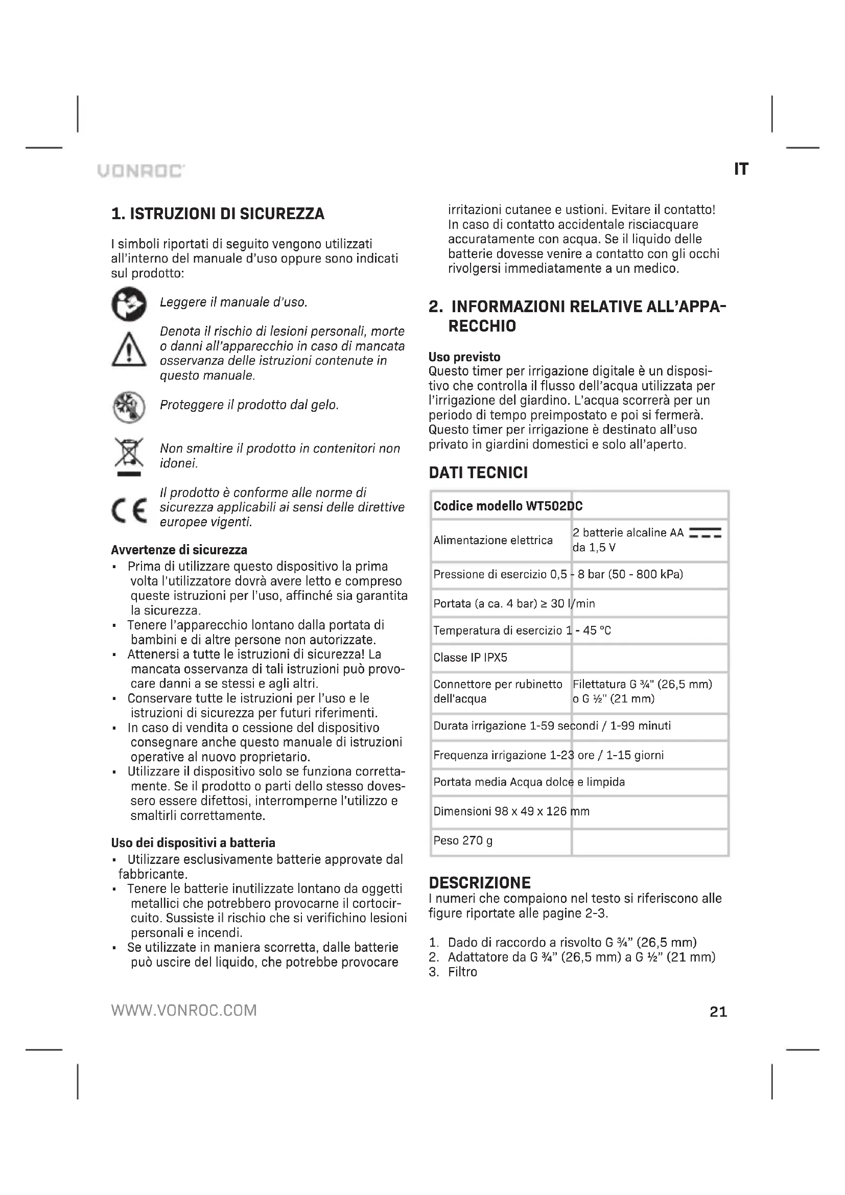WT502DC - Programmatore irrigazione Vonroc - Manuale utente e istruzioni gratuiti