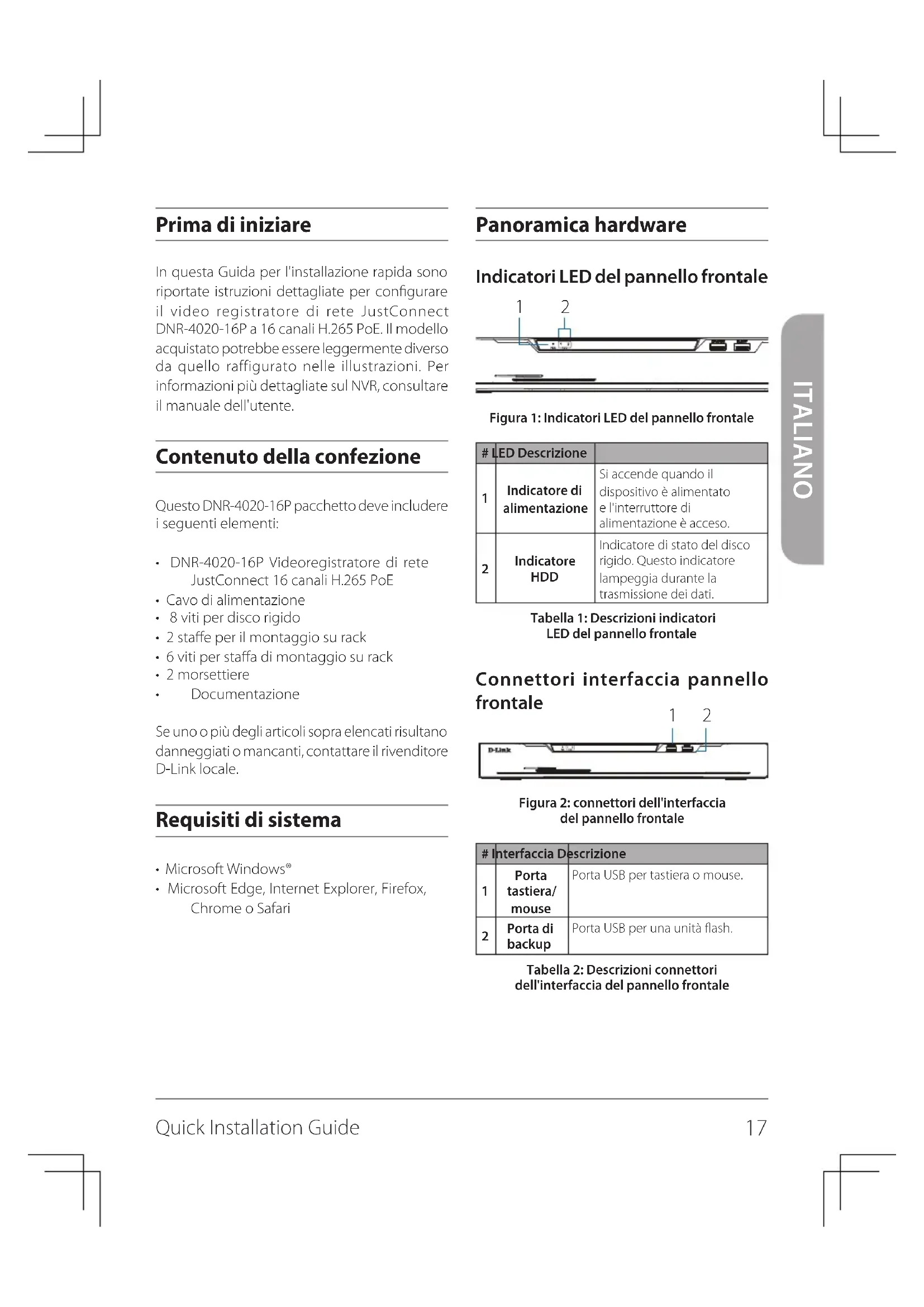 ITALIANO Panoramica hardware Indicatori LED del pannello frontale Figura 1: Indicatori LED del pannello frontale# LED Descrizione Indicatore di alimentazioneSi accende quando il dispositivo è alimentato e l'interruttore di alimentazione è acceso. Indicatore HDD Indicatore di stato del disco rigido. Questo indicatore lampeggia durante la trasmissione dei dati.Tabella 1: Descrizioni indicatori LED del pannello frontale Connettori interfaccia pannello frontale Figura 2: connettori dell'interfaccia del pannello frontale# Interfaccia Descrizione Porta tastiera/mousePorta USB per tastiera o mouse. Porta di backupPorta USB per una unità flash.Tabella 2: Descrizioni connettori dell'interfaccia del pannello frontale Prima di iniziare In questa Guida per l'installazione rapida sono riportate istruzioni dettagliate per configurare il video registratore di rete JustConnect DNR-4020-16P a 16 canali H.265 PoE. Il modello acquistato potrebbe essere leggermente diverso da quello raffigurato nelle illustrazioni. Per informazioni più dettagliate sul NVR, consultare il manuale dell'utente. Contenuto della confezione Questo DNR-4020-16P pacchetto deve includere i seguenti elementi: