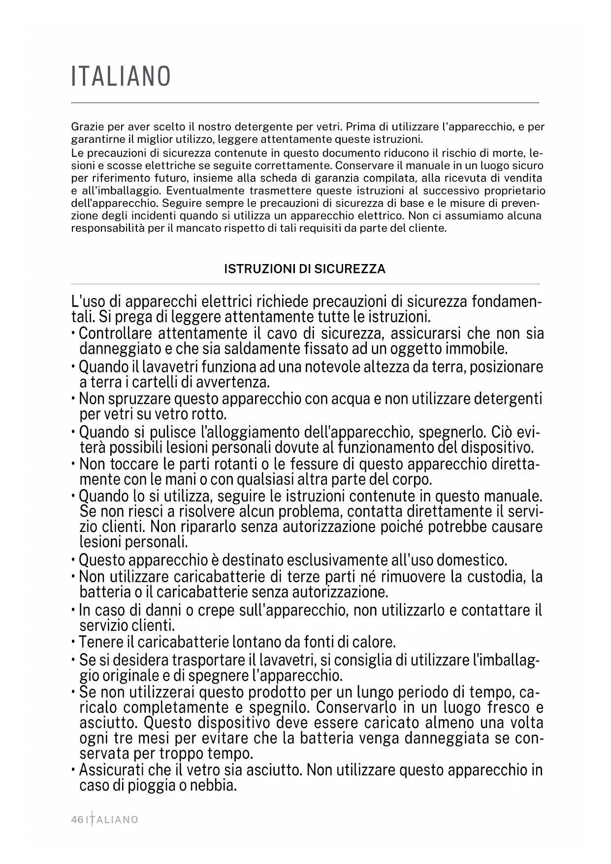 - Lorsqu'il n'y a ni sable ni poussière, vaporisez légèrement de l'eau propre ou du détergent plusieurs fois sur la vadrouille ou le verre, sans trop le mouiller.46 ITALIANO ITALIANO Grazie per aver scelto il nostro detergente per vetri. Prima di utilizzare l'apparecchio, e per garantirne il miglior utilizzo, leggere attentamente queste istruzioni. Le precauzioni di sicurezza contenute in questo documento riducono il rischio di morte, le- sioni e scosse elettriche se seguite correttamente. Conservare il manuale in un luogo sicuro per riferimento futuro, insieme alla scheda di garanzia compilata, alla ricevuta di vendita e all'imballaggio. Eventualmente trasmettere queste istruzioni al successivo proprietario dell'apparecchio. Seguire sempre le precauzioni di sicurezza di base e le misure di preven- zione degli incidenti quando si utilizza un apparecchio elettrico. Non ci assumiamo alcuna responsabilità per il mancato rispetto di tali requisiti da parte del cliente.