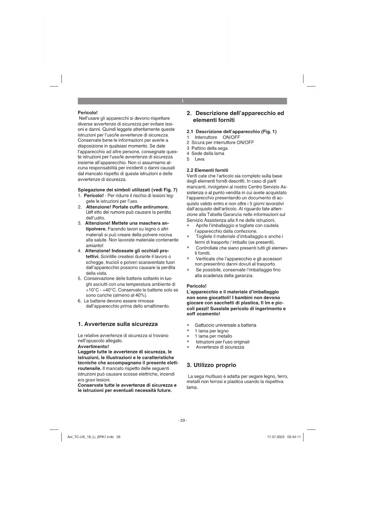 La sega multiuso è adatta per segare legno, ferro, metalli non ferrosi e plastica usando la rispettiva lama. Anl_TC-US_18_Li_SPK7.indb 29Anl_TC-US_18_Li_SPK7.indb 29 17.07.2023 09:34:1117.07.2023 09:34:11I