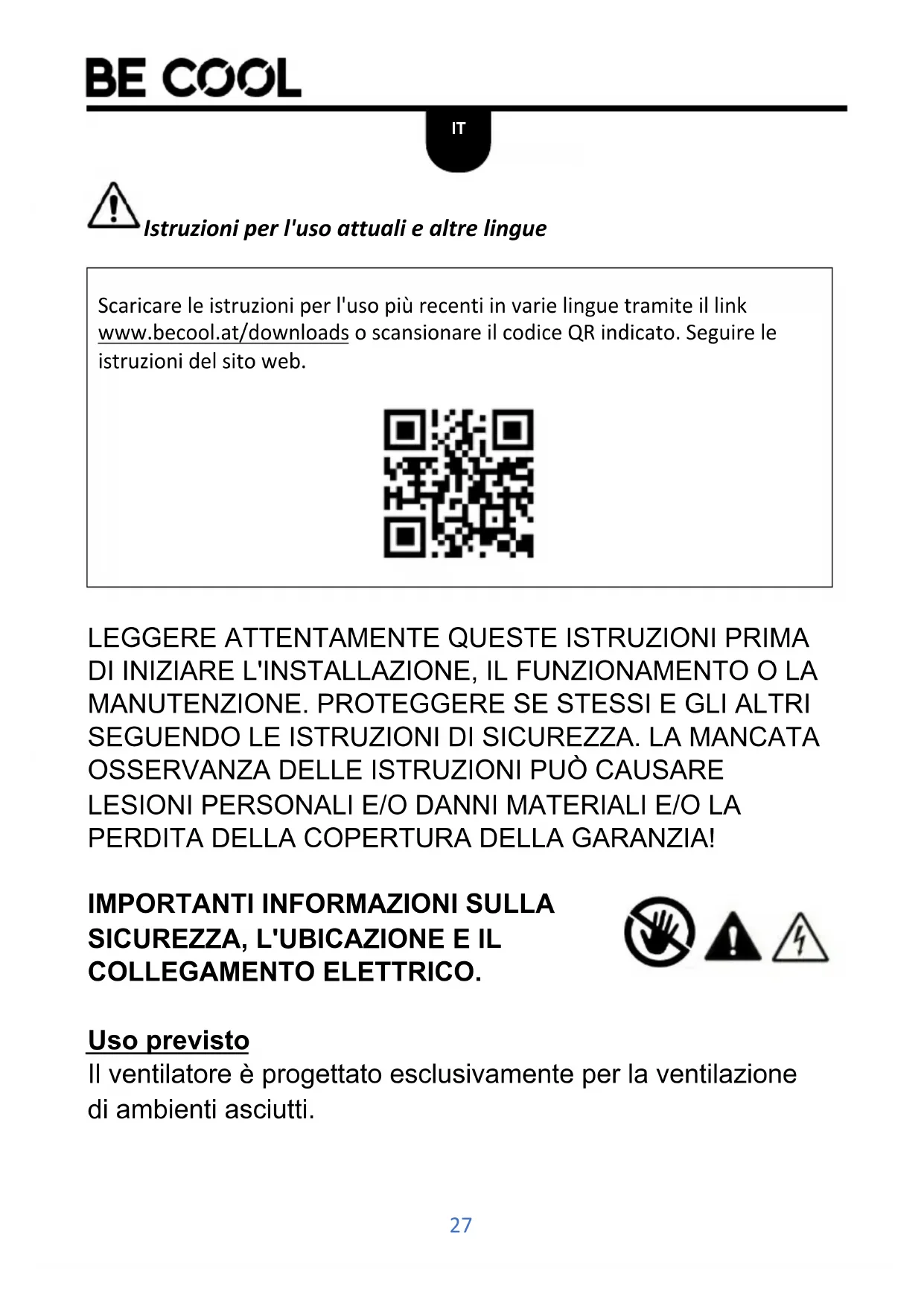 Scaricare le istruzioni per l'uso più recenti in varie linguetramite il link www.becool.at/downloads o scansionare il codice QRindicato.Seguire le istruzioni del site web.