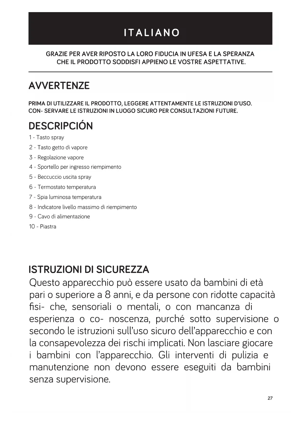 PIASTRA Non c'è abbastanza acqua nel serbatoio. Non c'è abbastanza acqua nel serbatoio. Riempire il serbatoio dell'acqua. Riempire il serbatoio dell'acqua.33 WIR MÖCHTEN IHNEN DANKEN, DASS SIE SICH FÜR UFESA ENTSCHIEDEN HABEN. WIR WÜNSCHEN IHNEN VIEL FREUDE UND ZUFRIEDENHEIT MIT IHREM GERÄT. WARNHINWEIS BITTE LESEN SIE DIE GEBRAUCHSANWEISUNG VOR DER VERWENDUNG DES GERÄTS SORGFÄL TIG DURCH. BEWAHREN SIE SIE ZUM SPÄTEREN NACHSCHLAGEN AN EINEM SICHEREN ORT AUF. BESCHREIBUNG