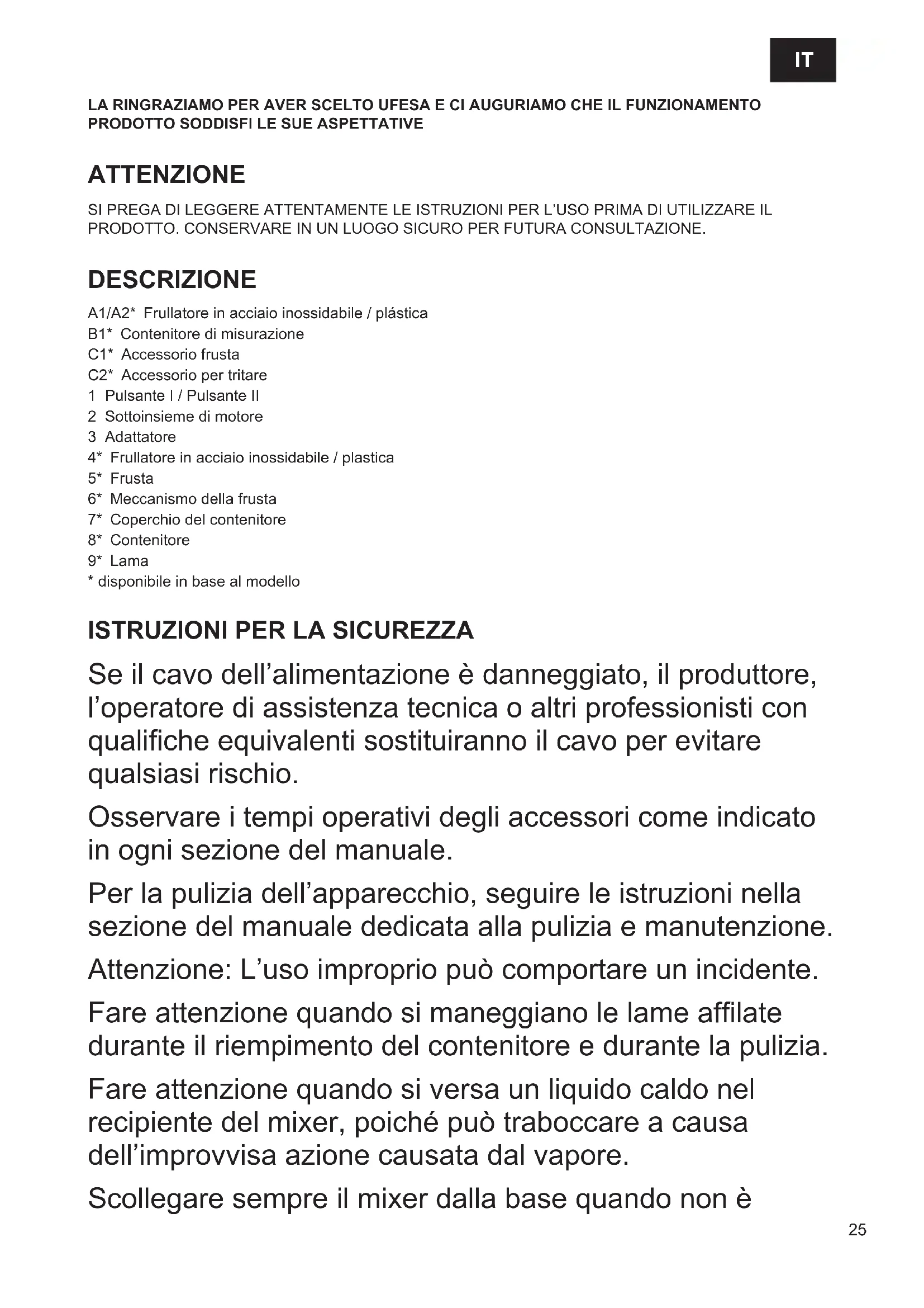 Se il cavo dell’alimentazione è danneggiato, il produttore, l’operatore di assistenza tecnica o altri professionisti con qualiche equivalenti sostituiranno il cavo per evitare qualsiasi rischio. Osservare i tempi operativi degli accessori come indicato in ogni sezione del manuale. Per la pulizia dell’apparecchio, seguire le istruzioni nella sezione del manuale dedicata alla pulizia e manutenzione. Attenzione: L’uso improprio può comportare un incidente. Fare attenzione quando si maneggiano le lame aflate durante il riempimento del contenitore e durante la pulizia. Fare attenzione quando si versa un liquido caldo nel recipiente del mixer, poiché può traboccare a causa dell’improvvisa azione causata dal vapore. Scollegare sempre il mixer dalla base quando non è26