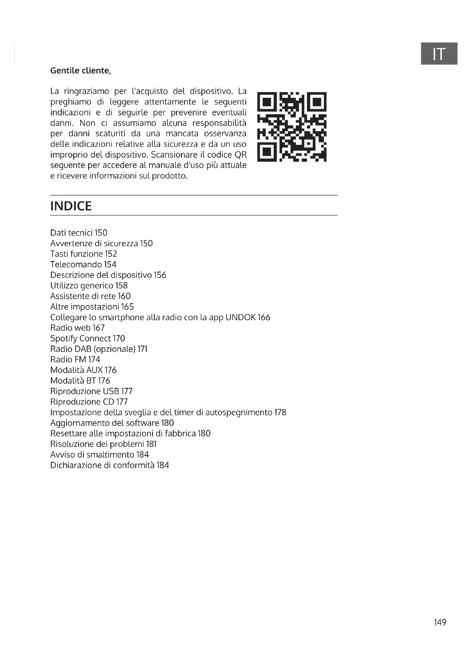 Gentile cliente, La ringraziamo per l'acquisto del dispositivo. La preghiamo di leggere attentamente le seguenti indicazioni e di seguirle per prevenire eventuali danni. Non ci assumiamo alcuna responsabilità per danni scaturiti da una mancata osservanza delle indicazioni relative alla sicurezza e da un uso improprio del dispositivo. Scansionare il codice QR seguente per accedere al manuale d'uso più attuale e ricevere informazioni sul prodotto. INDICE Dati tecnici 150 Avvertenze di sicurezza 150 Tasti funzione 152 Telecomando 154 Descrizione del dispositivo 156 Utilizzo generico 158 Assistente di rete 160 Altre impostazioni 165 Collegare lo smartphone alla radio con la app UNDOK 166 Radio web 167 Spotify Connect 170 Radio DAB (opzionale) 171 Radio FM 174 Modalità AUX 176 Modalità BT 176 Riproduzione USB 177 Riproduzione CD 177 Impostazione della sveglia e del timer di autospegnimento 178 Aggiornamento del software 180 Resettare alle impostazioni di fabbrica 180 Risoluzione dei problemi 181 Avviso di smaltimento 184 Dichiarazione di conformità 184150