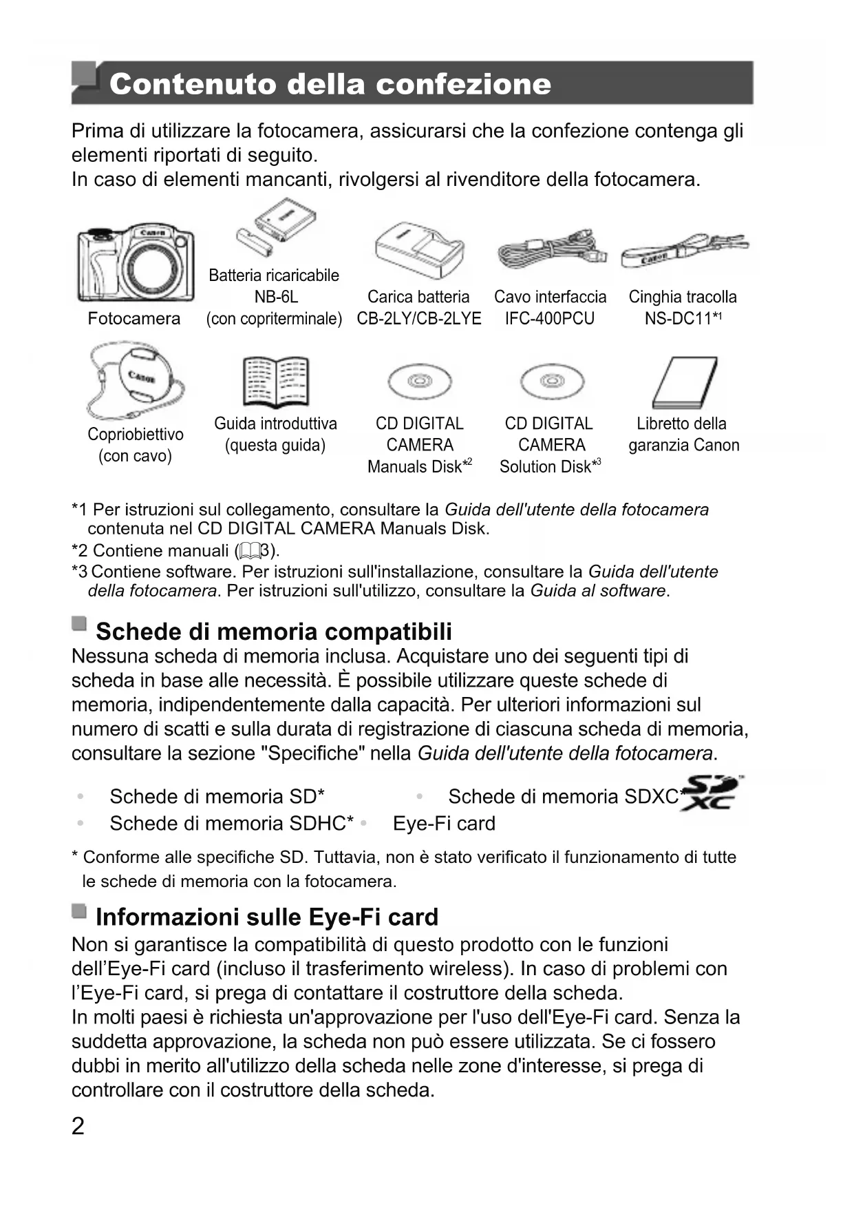 Libretto della garanzia Canon *1 Per istruzioni sul collegamento, consultare la Guida dell'utente della fotocamera contenuta nel CD DIGITAL CAMERA Manuals Disk. *2 Contiene manuali (= 3). *3 Contiene software. Per istruzioni sull'installazione, consultare la Guida dell'utente della fotocamera. Per istruzioni sull'utilizzo, consultare la Guida al software. Schede di memoria compatibili Nessuna scheda di memoria inclusa. Acquistare uno dei seguenti tipi di scheda in base alle necessità. È possibile utilizzare queste schede di memoria, indipendentemente dalla capacità. Per ulteriori informazioni sul numero di scatti e sulla durata di registrazione di ciascuna scheda di memoria, consultare la sezione "Speciche" nella Guida dell'utente della fotocamera.