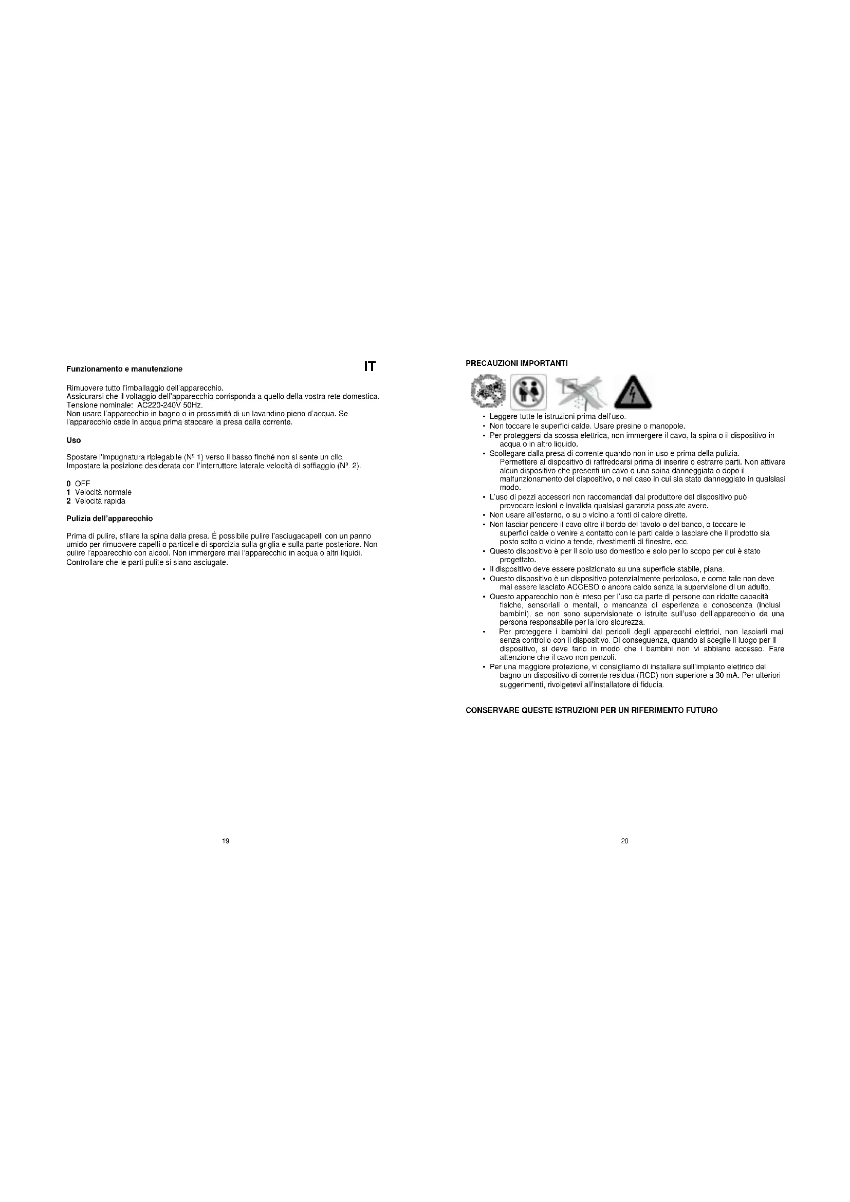 Rimuovere tutto l’imballaggio dell’apparecchio. Assicurarsi che il voltaggio dell’apparecchio corrisponda a quello della vostra rete domestica. Tensione nominale: AC220-240V 50Hz. Non usare l’apparecchio in bagno o in prossimità di un lavandino pieno d’acqua. Se l’apparecchio cade in acqua prima staccare la presa dalla corrente. Uso Spostare l’impugnatura ripiegabile (Nº 1) verso il basso finché non si sente un clic. Impostare la posizione desiderata con l’interruttore laterale velocità di soffiaggio (Nº. 2). 0 OFF 1 Velocità normale 2 Velocità rapida Pulizia dell’apparecchio Prima di pulire, sfilare la spina dalla presa. È possibile pulire l’asciugacapelli con un panno umido per rimuovere capelli o particelle di sporcizia sulla griglia e sulla parte posteriore. Non pulire l’apparecchio con alcool. Non immergere mai l’apparecchio in acqua o altri liquidi. Controllare che le parti pulite si siano asciugate.