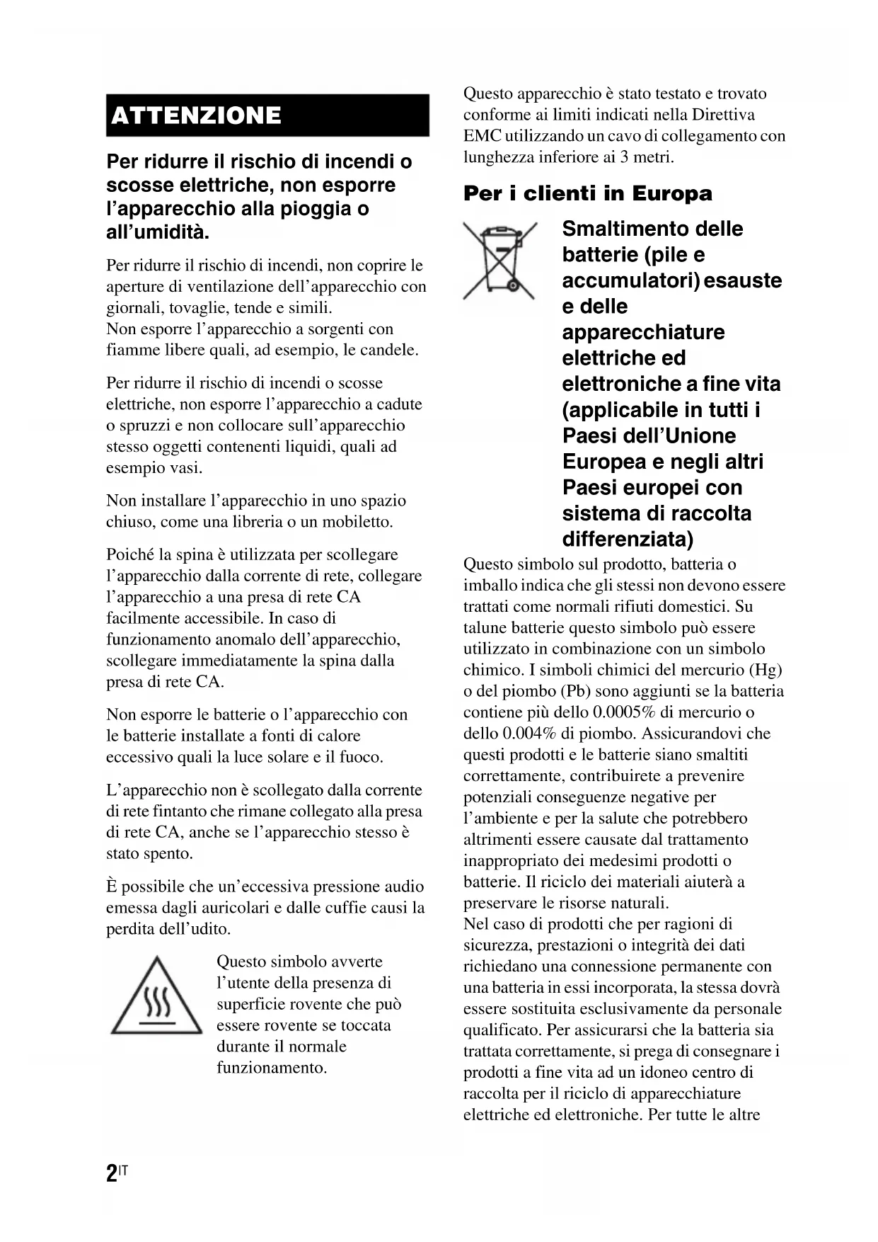Per ridurre il rischio di incendi o scosse elettriche, non esporre l’apparecchio alla pioggia o all’umidità. Per ridurre il rischio di incendi, non coprire le aperture di ventilazione dell’apparecchio con giornali, tovaglie, tende e simili. Non esporre l’apparecchio a sorgenti con fiamme libere quali, ad esempio, le candele. Per ridurre il rischio di incendi o scosse elettriche, non esporre l’apparecchio a cadute o spruzzi e non collocare sull’apparecchio stesso oggetti contenenti liquidi, quali ad esempio vasi. Non installare l’apparecchio in uno spazio chiuso, come una libreria o un mobiletto. Poiché la spina è utilizzata per scollegare l’apparecchio dalla corrente di rete, collegare l’apparecchio a una presa di rete CA facilmente accessibile. In caso di funzionamento anomalo dell’apparecchio, scollegare immediatamente la spina dalla presa di rete CA. Non esporre le batterie o l’apparecchio con le batterie installate a fonti di calore eccessivo quali la luce solare e il fuoco. L’apparecchio non è scollegato dalla corrente di rete fintanto che rimane collegato alla presa di rete CA, anche se l’apparecchio stesso è stato spento. È possibile che un’eccessiva pressione audio emessa dagli auricolari e dalle cuffie causi la perdita dell’udito. Questo simbolo avverte l’utente della presenza di superficie rovente che può essere rovente se toccata durante il normale funzionamento. Questo apparecchio è stato testato e trovato conforme ai limiti indicati nella Direttiva EMC utilizzando un cavo di collegamento con lunghezza inferiore ai 3 metri. Per i clienti in Europa Smaltimento delle batterie (pile e accumulatori) esauste e delle apparecchiature elettriche ed elettroniche a fine vita (applicabile in tutti i Paesi dell’Unione Europea e negli altri Paesi europei con sistema di raccolta differenziata) Questo simbolo sul prodotto, batteria o imballo indica che gli stessi non devono essere trattati come normali rifiuti domestici. Su talune batterie questo simbolo può essere utilizzato in combinazione con un simbolo chimico. I simboli chimici del mercurio (Hg) o del piombo (Pb) sono aggiunti se la batteria contiene più dello 0.0005% di mercurio o dello 0.004% di piombo. Assicurandovi che questi prodotti e le batterie siano smaltiti correttamente, contribuirete a prevenire potenziali conseguenze negative per l’ambiente e per la salute che potrebbero altrimenti essere causate dal trattamento inappropriato dei medesimi prodotti o batterie. Il riciclo dei materiali aiuterà a preservare le risorse naturali. Nel caso di prodotti che per ragioni di sicurezza, prestazioni o integrità dei dati richiedano una connessione permanente con una batteria in essi incorporata, la stessa dovrà essere sostituita esclusivamente da personale qualificato. Per assicurarsi che la batteria sia trattata correttamente, si prega di consegnare i prodotti a fine vita ad un idoneo centro di raccolta per il riciclo di apparecchiature elettriche ed elettroniche. Per tutte le altre ATTENZIONE3