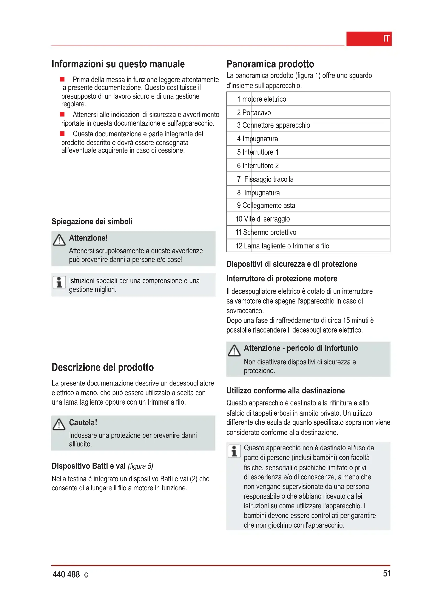 440 488_c Informazioni su questo manuale Prima della messa in funzione leggere attentamente la presente documentazione. Questo costituisce il presupposto di un lavoro sicuro e di una gestione regolare. Attenersi alle indicazioni di sicurezza e avvertimento riportate in questa documentazione e sull'apparecchio. Questa documentazione è parte integrante del prodotto descritto e dovrà essere consegnata all'eventuale acquirente in caso di cessione. Spiegazione dei simboli Attenzione! Attenersi scrupolosamente a queste avvertenze può prevenire danni a persone e/o cose! Istruzioni speciali per una comprensione e una gestione migliori. Descrizione del prodotto La presente documentazione descrive un decespugliatore elettrico a mano, che può essere utilizzato a scelta con unalamataglienteoppureconuntrimmeralo. Cautela! Indossare una protezione per prevenire danni all'udito. Dispositivo Batti e vai (gura 5) Nella testina è integrato un dispositivo Batti e vai (2) che consentediallungareilloamotoreinfunzione. Panoramica prodotto Lapanoramicaprodotto(gura1)offreunosguardo d'insieme sull'apparecchio. 1 motore elettrico 2 Portacavo 3 Connettore apparecchio 4 Impugnatura 5 Interruttore 1 6 Interruttore 2 7 Fissaggio tracolla 8 Impugnatura 9 Collegamento asta 10 Vite di serraggio 11 Schermo protettivo 12 Lamataglienteotrimmeralo Dispositivi di sicurezza e di protezione Interruttore di protezione motore Il decespugliatore elettrico è dotato di un interruttore salvamotore che spegne l'apparecchio in caso di sovraccarico. Dopo una fase di raffreddamento di circa 15 minuti è possibile riaccendere il decespugliatore elettrico. Attenzione - pericolo di infortunio Non disattivare dispositivi di sicurezza e protezione. Utilizzo conforme alla destinazione Questoapparecchioèdestinatoallarinituraeallo sfalcio di tappeti erbosi in ambito privato. Un utilizzo differentecheesuladaquantospecicatosopranonviene considerato conforme alla destinazione. Questo apparecchio non è destinato all'uso da parte di persone (inclusi bambini) con facoltà siche,sensorialiopsichichelimitateoprivi di esperienza e/o di conoscenze, a meno che non vengano supervisionate da una persona responsabile o che abbiano ricevuto da lei istruzioni su come utilizzare l'apparecchio. I bambini devono essere controllati per garantire che non giochino con l'apparecchio.52 Libretto di istruzioni originale Attenzione! L'apparecchio non può essere utilizzato in ambito professionale. Signicato dei simboli sull'apparecchio Attenzione! Leggere le istruzioni per l'uso Indossare occhiali protettivi e protezione per l'udito Indossare guanti protettivi Indossare calzature antinfortunistiche Tenere lontane terze persone. Distanza di sicurezza min. 10 m Pericolo dovuto a oggetti vaganti Estrarre immediatamente il connettore dalla rete qualora il cavo di prolunga venga danneggiato o tagliato Proteggere l'apparecchio da pioggia e umidità La distanza tra l'apparecchio e terze persone deve corrispondere almeno a 15 m Indicazioni di sicurezza Attenzione! La rotazione dell'utensile di taglio prosegue anche dopo aver spento il motore. Primadell'usovericarechelelineedireteedi prolunga non presentino segni di danneggiamento o invecchiamento. Tenere lontane le linee di prolunga dagli attrezzi di taglio. Se durante l'uso la linea viene danneggiata, separarla immediatamente dalla rete. NON TOCCARE LA LINEA PRIMA DI AVERLA SEPARATA DALLA RETE. Indossare abbigliamento adatto, protezione per gli occhi e guanti. Non consentire mai a bambini o persone non addestrate di utilizzare la macchina o di eseguirne la riparazione. L'età minima della persona addetta all'uso potrebbeesseredenitadadisposizionialivellolocale. Interrompere l'uso della macchina quando persone, soprattutto bambini o animali domestici, si trovano nelle vicinanze. Tagliare l'erba solo in presenza di luce diurna o di una buonailluminazionearticiale. Prima di mettere in funzione la macchina e dopo eventualiimpatti,vericarechenonpresentisegnidi usura o danneggiamento e far svolgere le riparazioni eventualmente necessarie. Non utilizzare mai l'apparecchio con dispositivi di protezione danneggiati o mancanti. Tenere sempre mani e piedi lontani dal dispositivo di taglio, soprattutto quando si accende il motore. Qualsiasi dispositivo che serve a tagliare la lunghezza dellogenerapericolodiinfortunio. Dopoaverslatounnuovolo,teneresemprela macchina nella sua normale posizione di lavoro prima di accenderla. Utilizzare solo ricambi originali e accessori originali. Slareilconnettoreprimadiprove,pulizieolavorisulla macchina e quando non sono in uso. Assicurarsi che le prese d'aria rimangano libere dalla sporcizia. Nonostante le misure di protezione tecniche e integrative, rimane sempre un rischio residuo quando si lavora con la macchina. Mantenere le impugnature asciutte e pulite. Rimuovere i corpi estranei nell'area di lavoro. Utilizzare l'apparecchio solo se in condizioni tecniche perfette.53