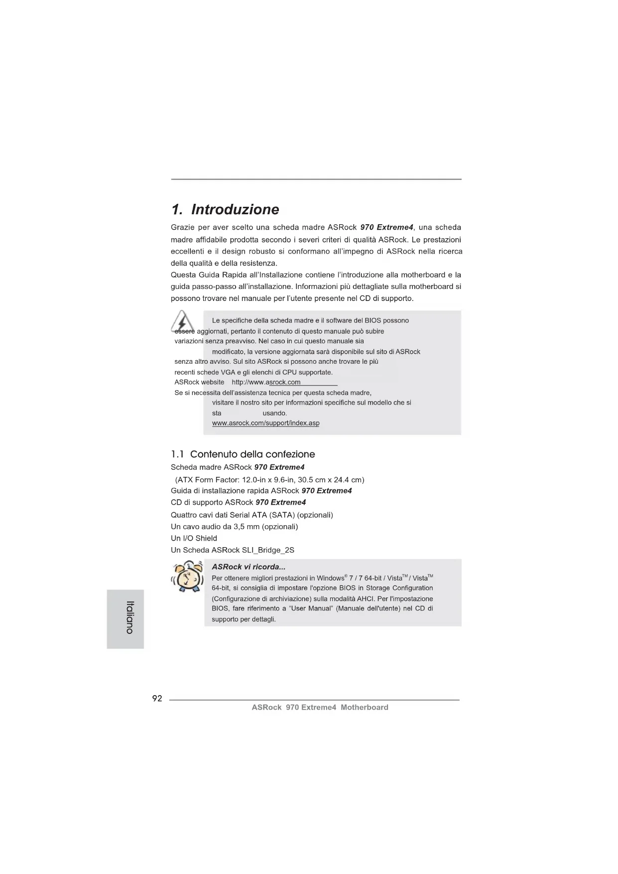 Grazie per aver scelto una scheda madre ASRock 970 Extreme4, una scheda madre affi dabile prodotta secondo i severi criteri di qualità ASRock. Le prestazioni eccellenti e il design robusto si conformano all’impegno di ASRock nella ricerca della qualità e della resistenza. Questa Guida Rapida all’Installazione contiene l’introduzione alla motherboard e la guida passo-passo all’installazione. Informazioni più dettagliate sulla motherboard si possono trovare nel manuale per l’utente presente nel CD di supporto. Le specifi che della scheda madre e il software del BIOS possono essere aggiornati, pertanto il contenuto di questo manuale può subire variazioni senza preavviso. Nel caso in cui questo manuale sia modifi cato, la versione aggiornata sarà disponibile sul sito di ASRock senza altro avviso. Sul sito ASRock si possono anche trovare le più recenti schede VGA e gli elenchi di CPU supportate. ASRock website http://www.asrock.com Se si necessita dell’assistenza tecnica per questa scheda madre, visitare il nostro sito per informazioni specifi che sul modello che si sta usando. www.asrock.com/support/index.asp