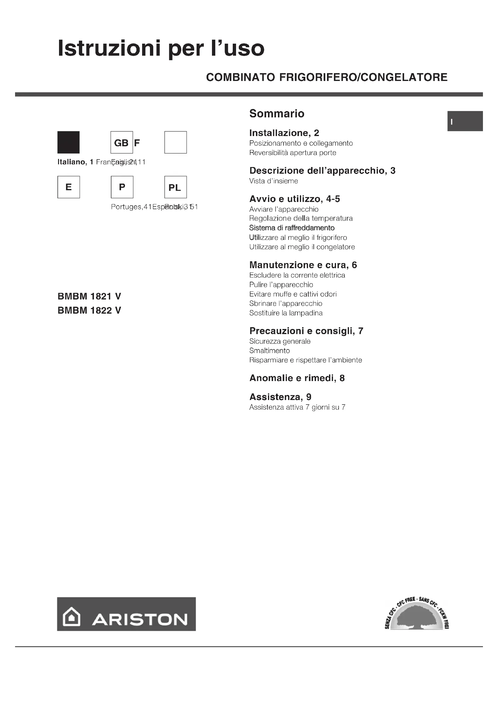 BMBM 1821 V BMBM 1822 V Sommario Installazione, 2 Posizionamento e collegamento Reversibilità apertura porte Descrizione dellapparecchio, 3 Vista dinsieme Avvio e utilizzo, 4-5 Avviare lapparecchio Regolazione della temperatura Sistema di raffreddamento Utilizzare al meglio il frigorifero Utilizzare al meglio il congelatore Manutenzione e cura, 6 Escludere la corrente elettrica Pulire lapparecchio Evitare muffe e cattivi odori Sbrinare lapparecchio Sostituire la lampadina Precauzioni e consigli, 7 Sicurezza generale Smaltimento Risparmiare e rispettare lambiente Anomalie e rimedi, 8 Assistenza, 9 Assistenza attiva 7 giorni su 7 Polski, 51 PL2