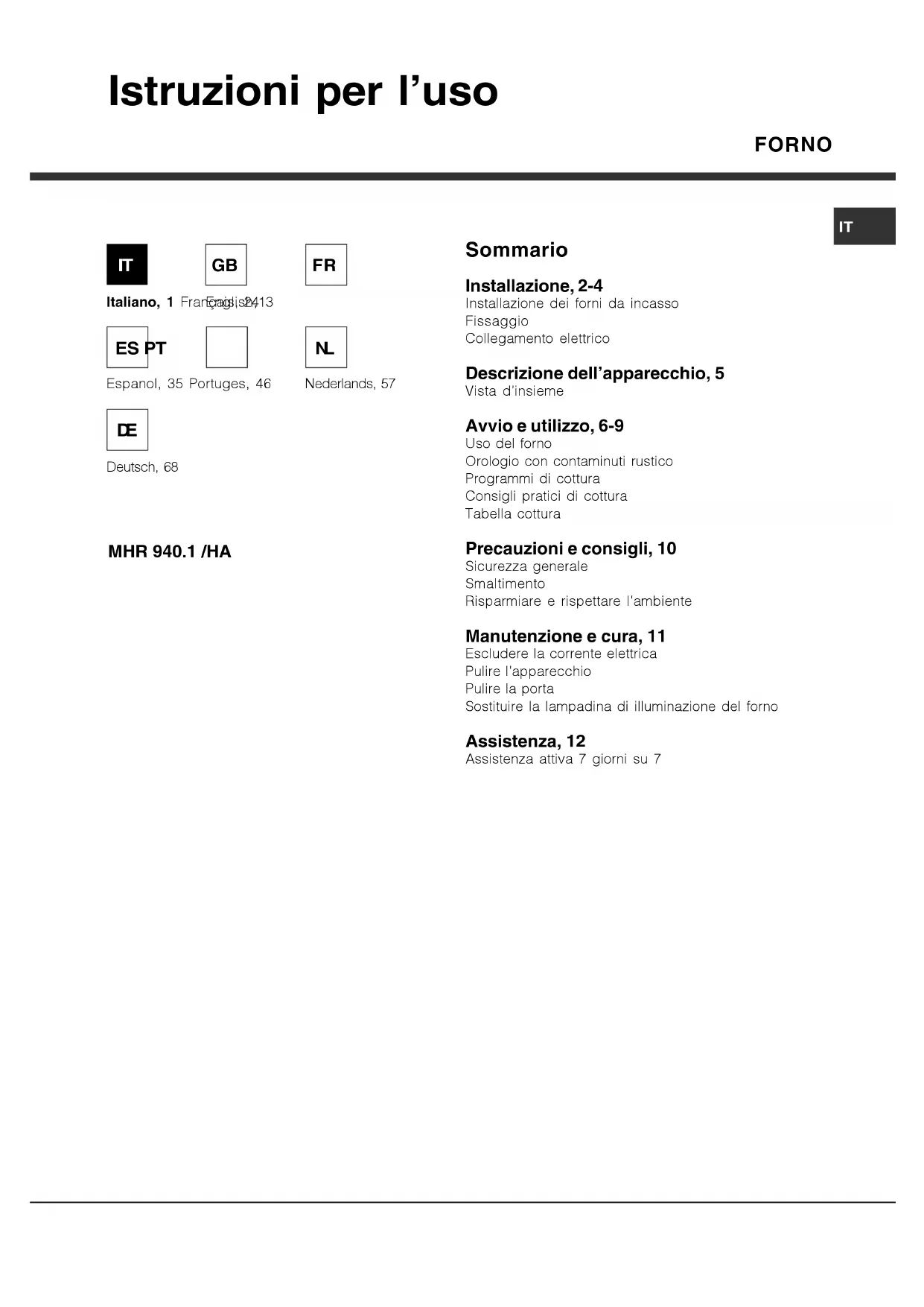 FORNO MHR 940.1 /HA Sommario Installazione, 2-4 Installazione dei forni da incasso Fissaggio Collegamento elettrico Descrizione dell’apparecchio, 5 Vista d’insieme Avvio e utilizzo, 6-9 Uso del forno Orologio con contaminuti rustico Programmi di cottura Consigli pratici di cottura Tabella cottura Precauzioni e consigli, 10 Sicurezza generale Smaltimento Risparmiare e rispettare l’ambiente Manutenzione e cura, 11 Escludere la corrente elettrica Pulire l’apparecchio Pulire la porta Sostituire la lampadina di illuminazione del forno Assistenza, 12 Assistenza attiva 7 giorni su 7 Istruzioni per l’uso Italiano, 1 Français, 24 Espanol, 35 Portuges, 46 English,13