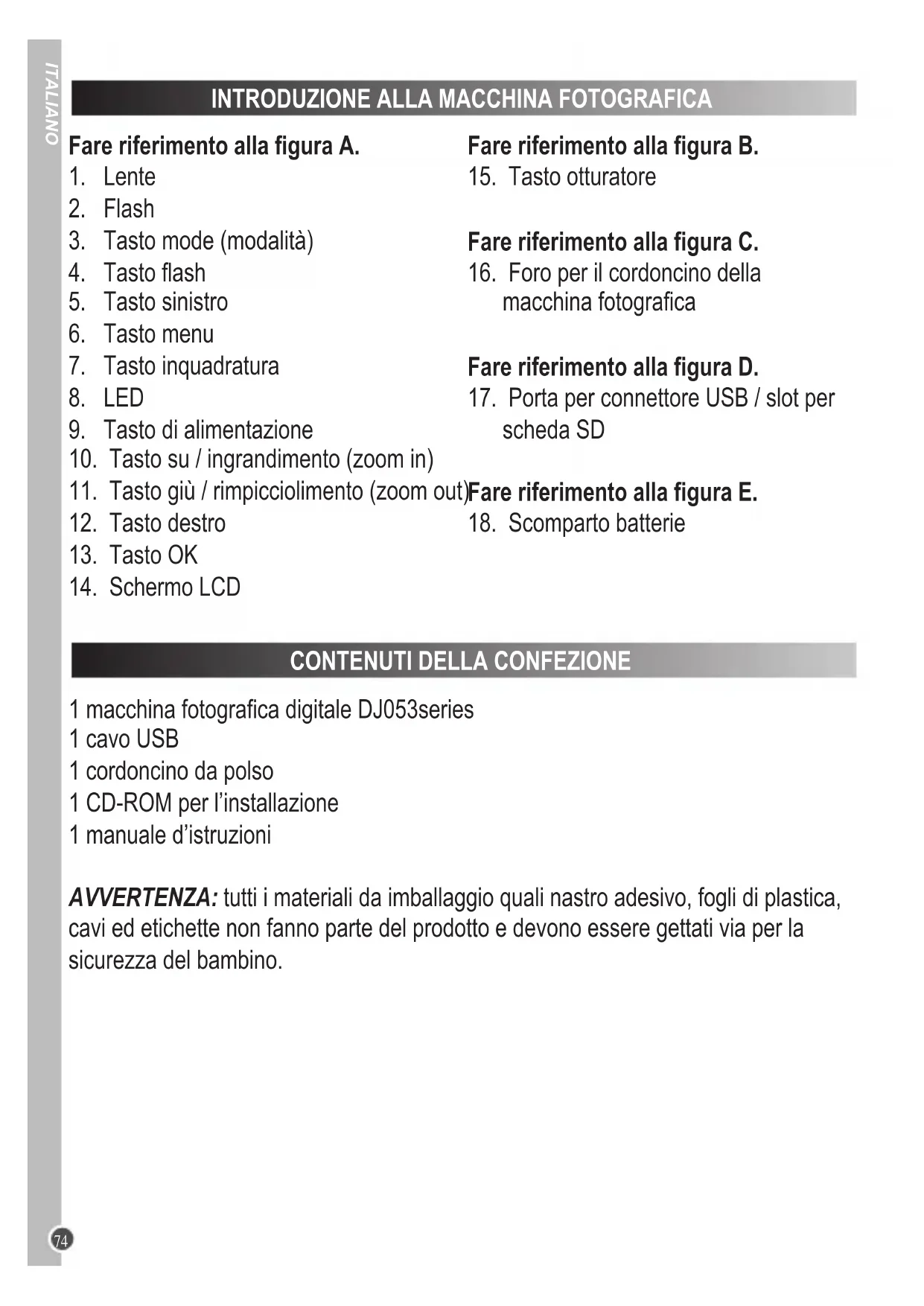 1 macchina fotograca digitale DJ053series 1 cavo USB 1 cordoncino da polso 1 CD-ROM per l’installazione 1 manuale d’istruzioni AVVERTENZA: tutti i materiali da imballaggio quali nastro adesivo, fogli di plastica, cavi ed etichette non fanno parte del prodotto e devono essere gettati via per la sicurezza del bambino. Fare riferimento alla gura B.