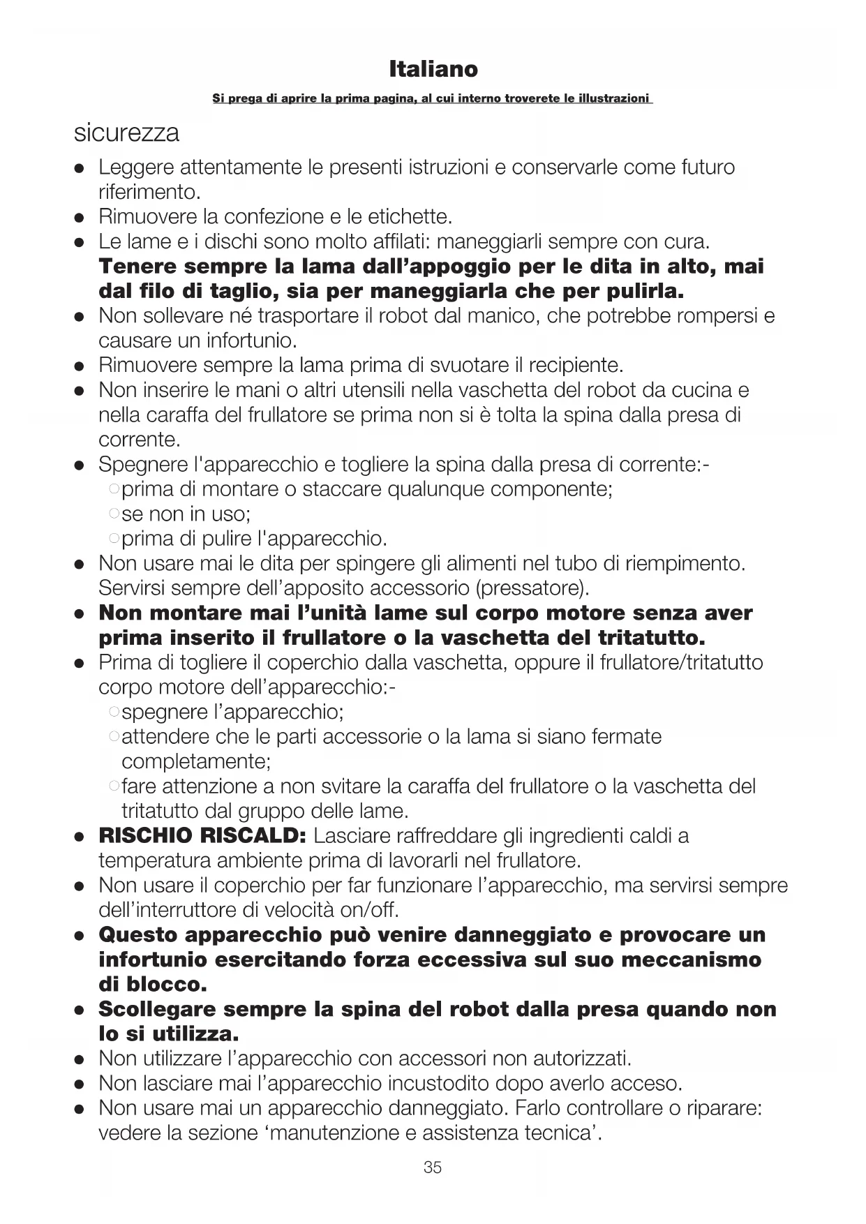 i prega di aprire la prima pagina, al cui interno troverete le illustrazioni ItalianoG Non bagnare il motore, il cavo o la spina.