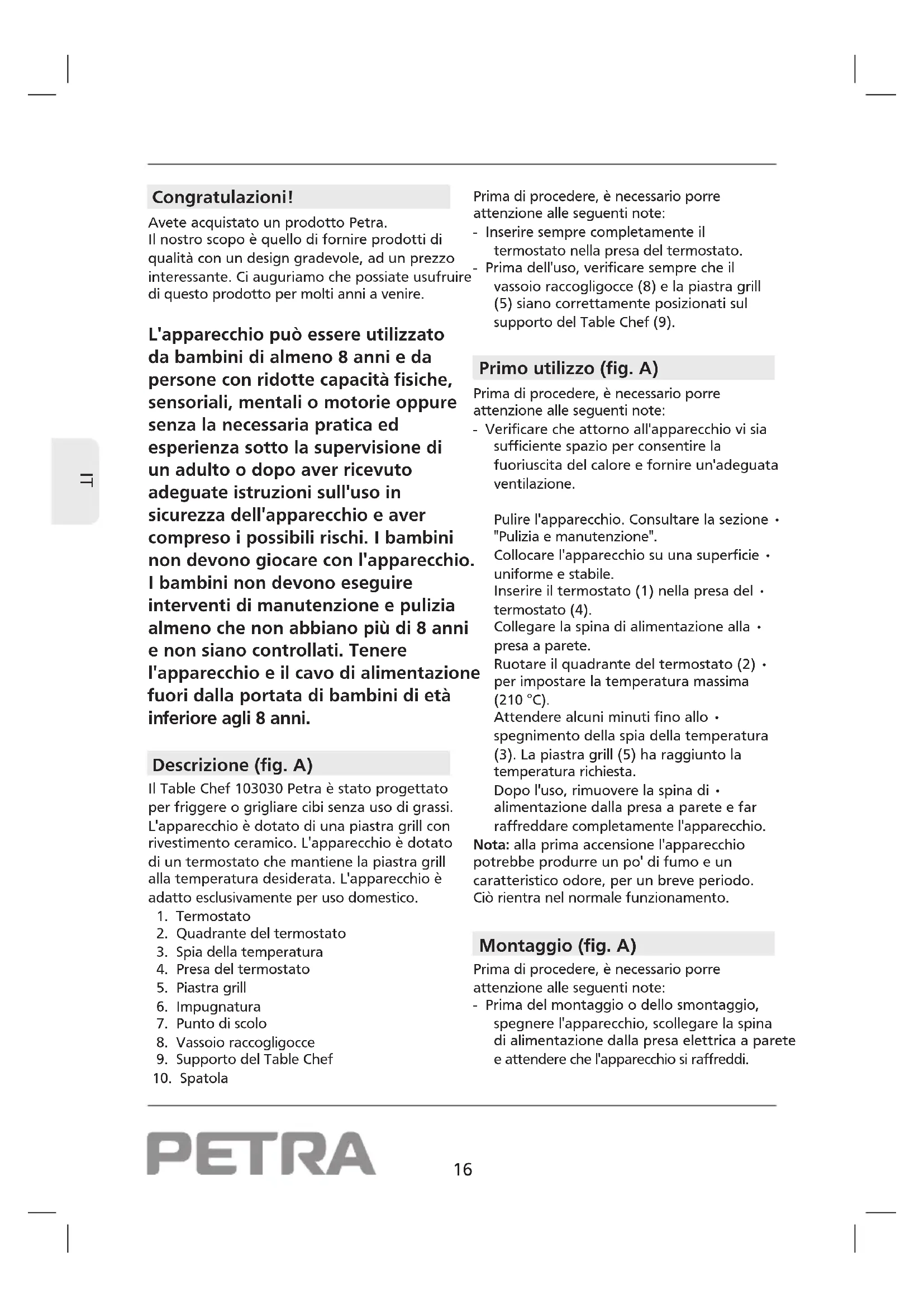 Congratulazioni! Avete acquistato un prodotto Petra. Il nostro scopo è quello di fornire prodotti di qualità con un design gradevole, ad un prezzo interessante. Ci auguriamo che possiate usufruire di questo prodotto per molti anni a venire. L'apparecchio può essere utilizzato da bambini di almeno 8 anni e da persone con ridotte capacità fisiche, sensoriali, mentali o motorie oppure senza la necessaria pratica ed esperienza sotto la supervisione di un adulto o dopo aver ricevuto adeguate istruzioni sull'uso in sicurezza dell'apparecchio e aver compreso i possibili rischi. I bambini non devono giocare con l'apparecchio. I bambini non devono eseguire interventi di manutenzione e pulizia almeno che non abbiano più di 8 anni e non siano controllati. Tenere l'apparecchio e il cavo di alimentazione fuori dalla portata di bambini di età inferiore agli 8 anni. Descrizione (fig. A) Il Table Chef 103030 Petra è stato progettato per friggere o grigliare cibi senza uso di grassi. L'apparecchio è dotato di una piastra grill con rivestimento ceramico. L'apparecchio è dotato di un termostato che mantiene la piastra grill alla temperatura desiderata. L'apparecchio è adatto esclusivamente per uso domestico.