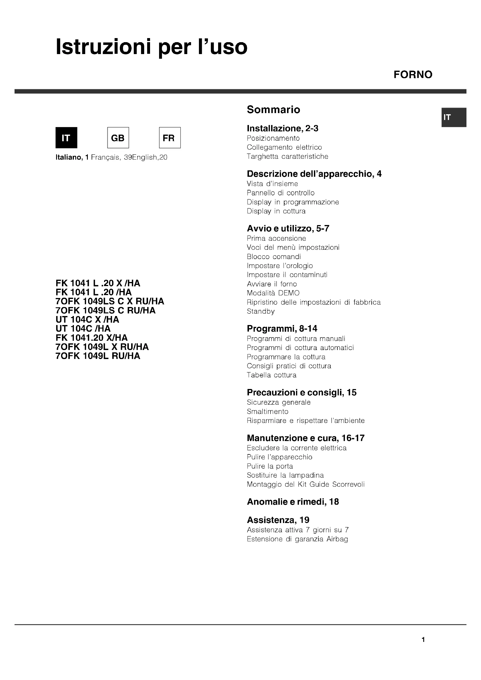 Sommario Installazione, 2-3 Posizionamento Collegamento elettrico Targhetta caratteristiche Descrizione dell’apparecchio, 4 Vista d’insieme Pannello di controllo Display in programmazione Display in cottura Avvio e utilizzo, 5-7 Prima accensione Voci del menù impostazioni Blocco comandi Impostare l’orologio Impostare il contaminuti Avviare il forno Modalità DEMO Ripristino delle impostazioni di fabbrica Standby Programmi, 8-14 Programmi di cottura manuali Programmi di cottura automatici Programmare la cottura Consigli pratici di cottura Tabella cottura Precauzioni e consigli, 15 Sicurezza generale Smaltimento Risparmiare e rispettare l’ambiente Manutenzione e cura, 16-17 Escludere la corrente elettrica Pulire l’apparecchio Pulire la porta Sostituire la lampadina Montaggio del Kit Guide Scorrevoli Anomalie e rimedi, 18 Assistenza, 19 Assistenza attiva 7 giorni su 7 Estensione di garanzia Airbag Italiano, 1 Français, 39English,20