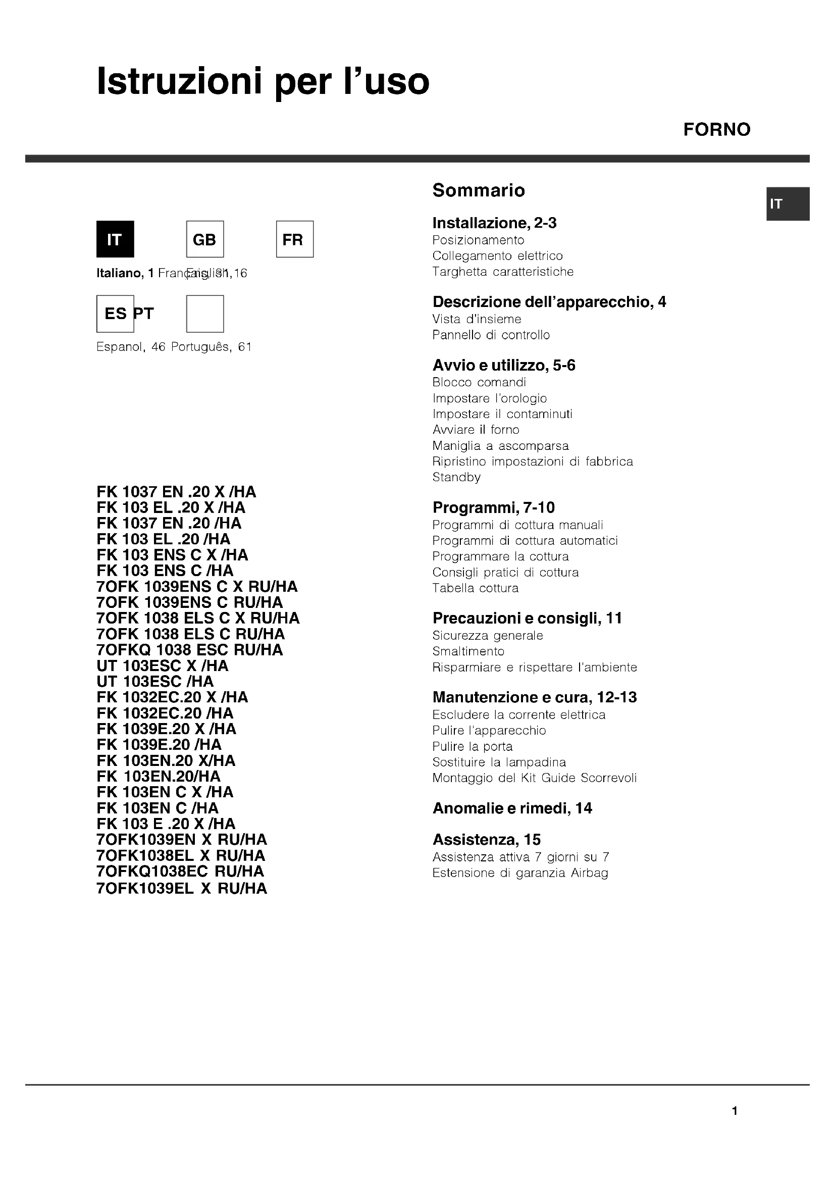Sommario Installazione, 2-3 Posizionamento Collegamento elettrico Targhetta caratteristiche Descrizione dell’apparecchio, 4 Vista d’insieme Pannello di controllo Avvio e utilizzo, 5-6 Blocco comandi Impostare l’orologio Impostare il contaminuti Avviare il forno Maniglia a ascomparsa Ripristino impostazioni di fabbrica Standby Programmi, 7-10 Programmi di cottura manuali Programmi di cottura automatici Programmare la cottura Consigli pratici di cottura Tabella cottura Precauzioni e consigli, 11 Sicurezza generale Smaltimento Risparmiare e rispettare l’ambiente Manutenzione e cura, 12-13 Escludere la corrente elettrica Pulire l’apparecchio Pulire la porta Sostituire la lampadina Montaggio del Kit Guide Scorrevoli Anomalie e rimedi, 14 Assistenza, 15 Assistenza attiva 7 giorni su 7 Estensione di garanzia Airbag Italiano, 1 Français, 31 Espanol, 46 Português, 61 English,16