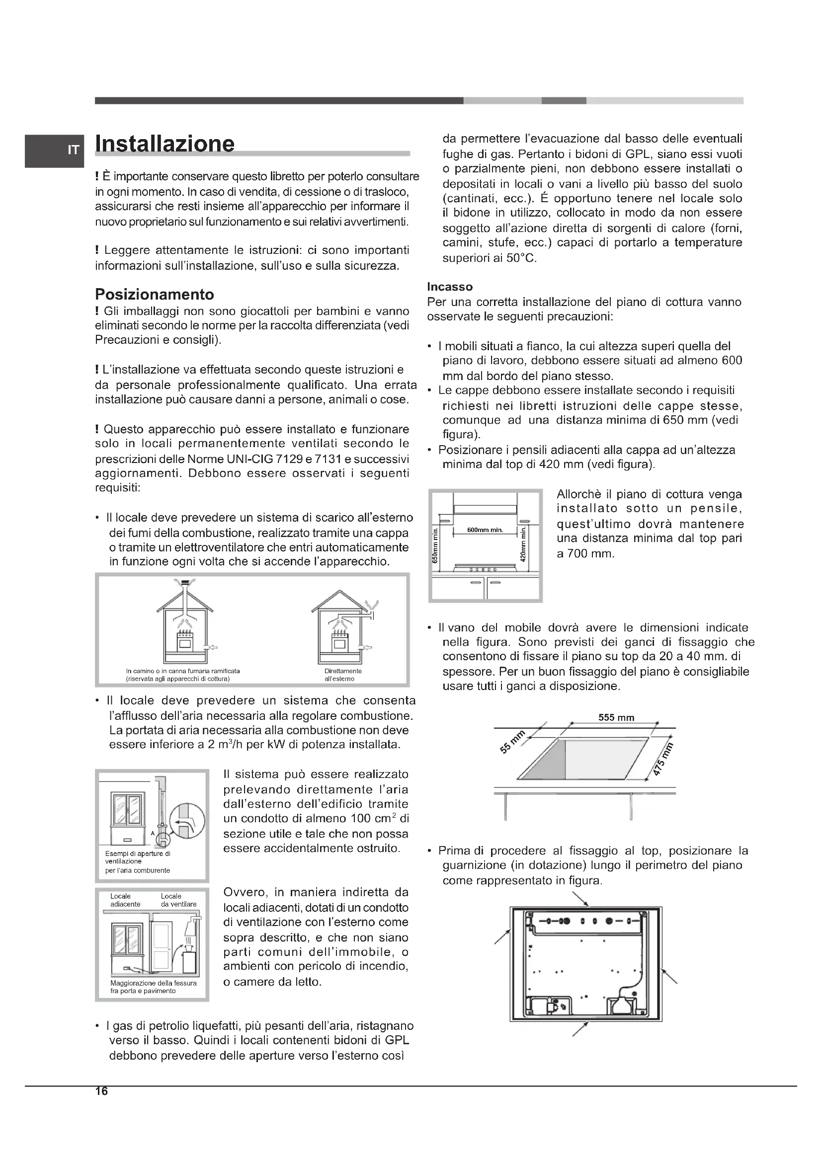 Installazione ! È importante conservare questo libretto per poterlo consultare in ogni momento. In caso di vendita, di cessione o di trasloco, assicurarsi che resti insieme all’apparecchio per informare il nuovo proprietario sul funzionamento e sui relativi avvertimenti. ! Leggere attentamente le istruzioni: ci sono importanti informazioni sull’installazione, sull’uso e sulla sicurezza. Posizionamento ! Gli imballaggi non sono giocattoli per bambini e vanno eliminati secondo le norme per la raccolta differenziata (vedi Precauzioni e consigli). ! L’installazione va effettuata secondo queste istruzioni e da personale professionalmente qualicato. Una errata installazione può causare danni a persone, animali o cose. ! Questo apparecchio può essere installato e funzionare solo in locali permanentemente ventilati secondo le prescrizioni delle Norme UNI-CIG 7129 e 7131 e successivi aggiornamenti. Debbono essere osservati i seguenti requisiti: