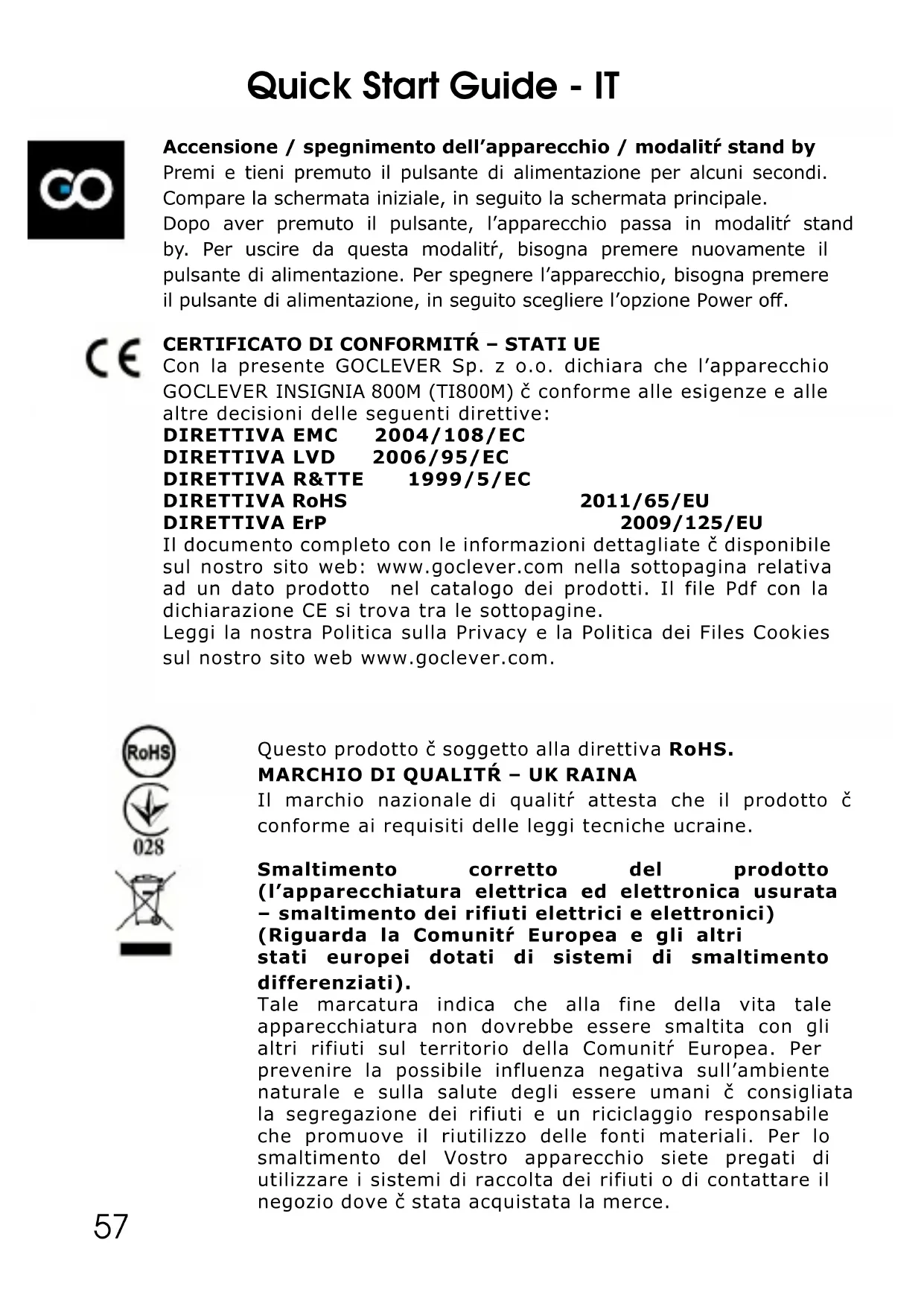 Con la presente GOCLEVER Sp. z o.o. dichiara che l’apparecchio GOCLEVER INSIGNIA 800M (TI800M) č conforme alle esigenze e alle altre decisioni delle seguenti direttive: