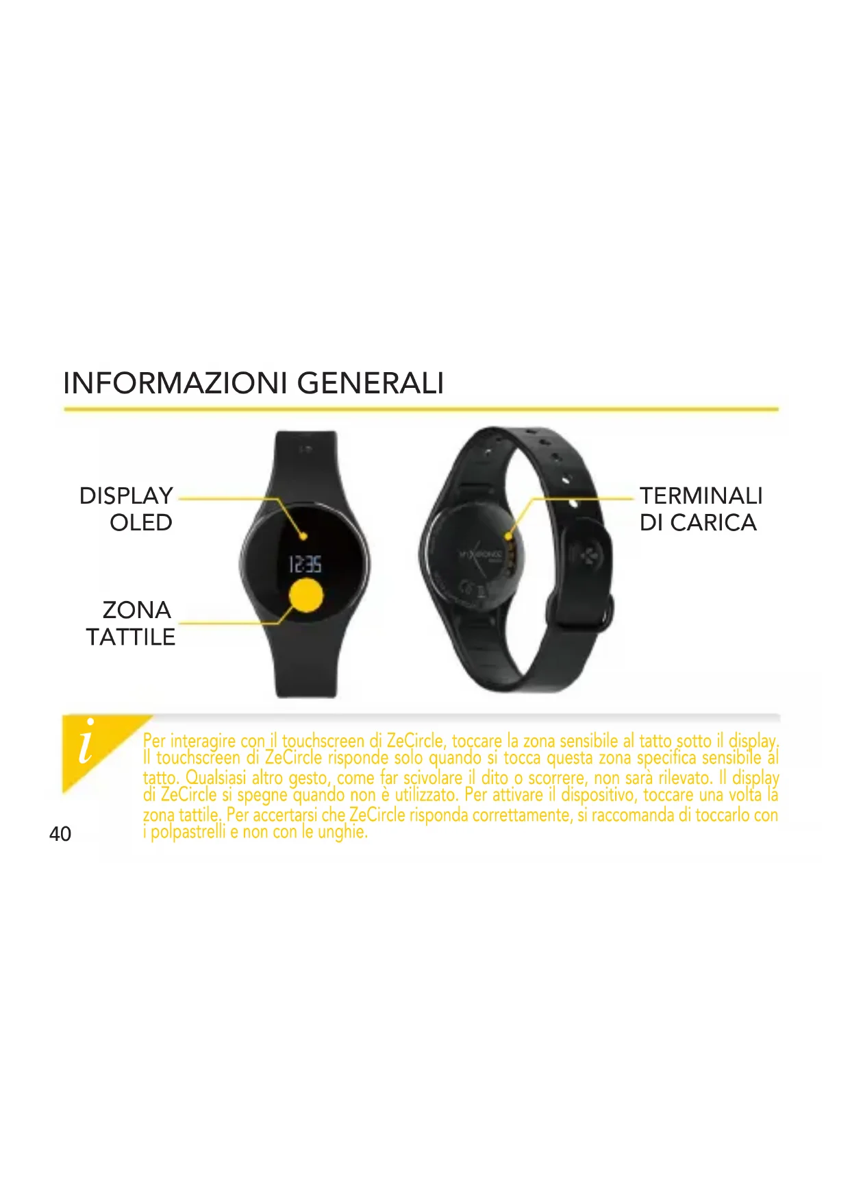 Per interagire con il touchscreen di ZeCircle, toccare la zona sensibile al fatto tanto il display. Il touchscreen di ZeCircle risponde solo quando si toccaquesta zona specifica sensibile al fatto. QualiasiAltro gesto, come far scivolare il dito o scorrere, non sare rilevato. Il display di ZeCircle si spegne quando non èutilizzato.Per attivare il dispositivo,toccare una volta la zona tattile.Per accertarsi che ZeCircle risponda correttamente, si raccomanda di toccarlo con i polpastrelli e non con le unghie.