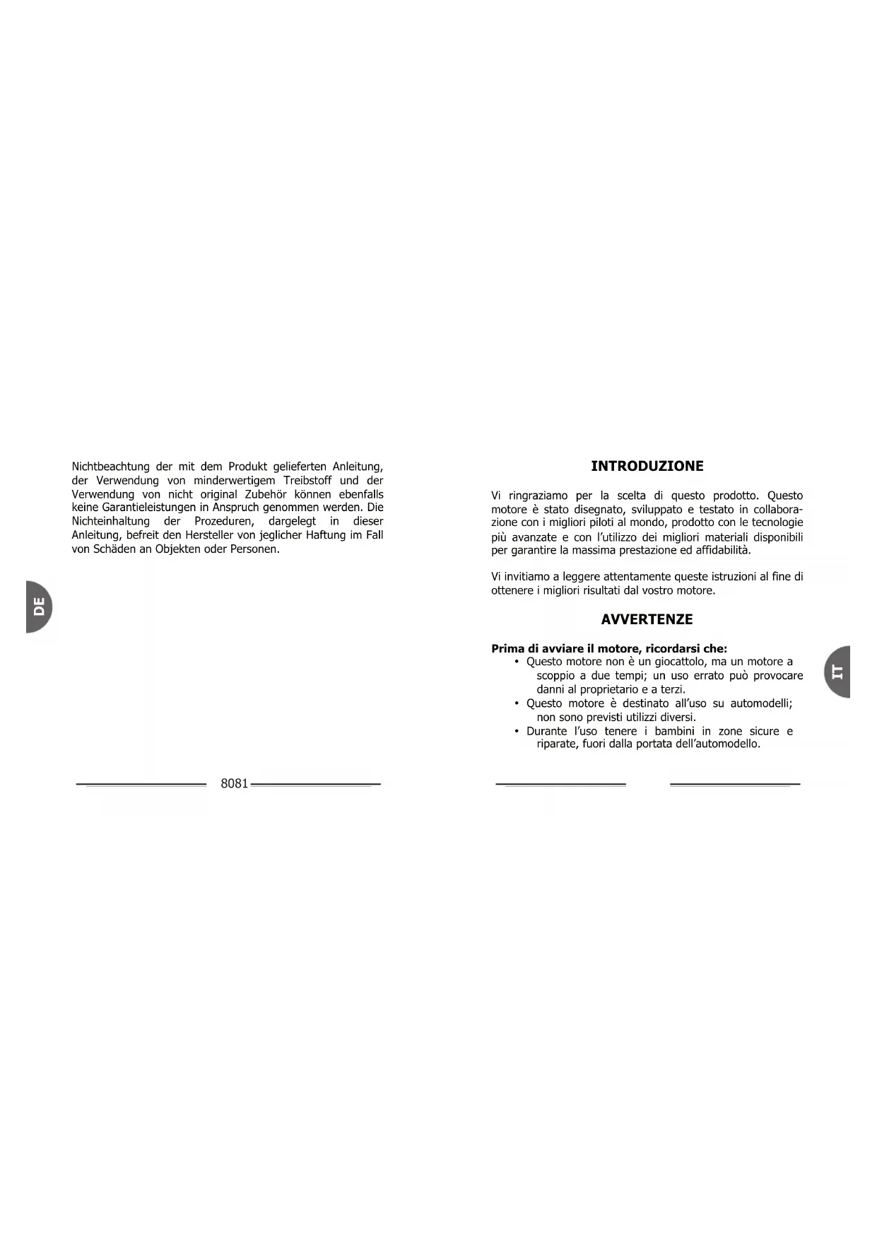 - Questo motore non è un giocattolo, ma un motore a scoppio a due tempi; un uso errato può provocare danni al proprietario e a terzi.