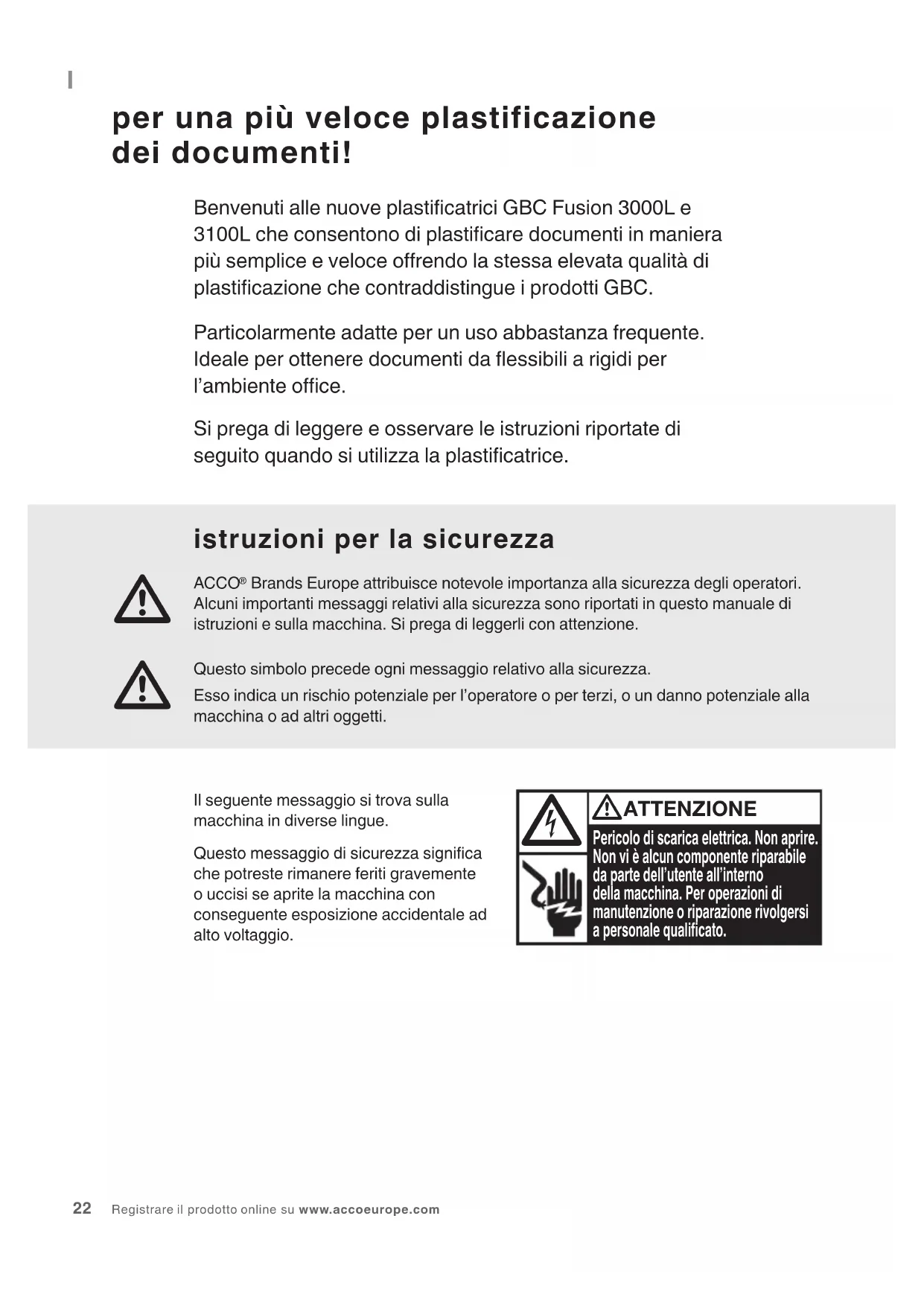 22 Registrare il prodotto online su www.accoeurope.comI assistenza Si prega di non tentare di eettuare interventi di manutenzione o riparazione da soli. Staccare la macchina dalla presa elettrica e rivolgersi per le riparazioni a un rivenditore o distributore GBC. informazioni importanti